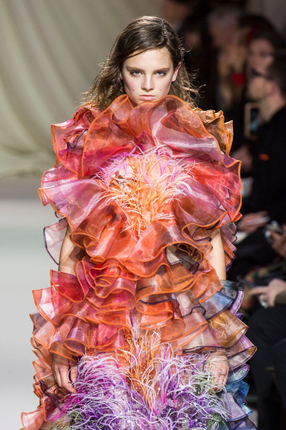 The last couple of gowns that closed the show were the culmination of the collection. Rainbow hues feathers, chiffon, ruffles and patterns came together in single looks for an ultimately dramatic ending.