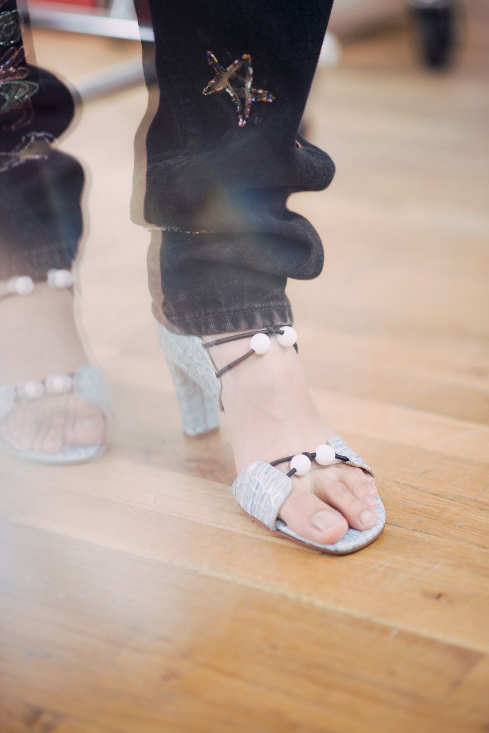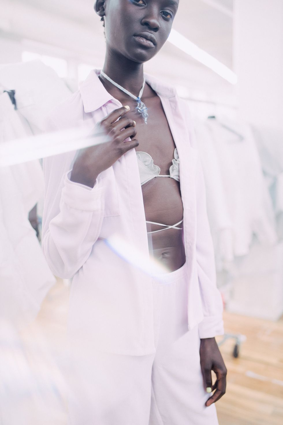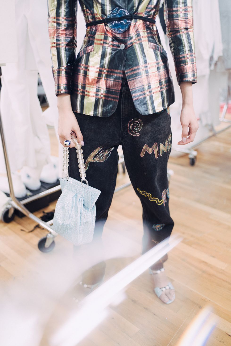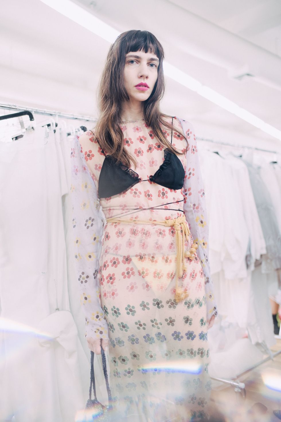 Maryam Nassir Zadeh has a thing for derelict venues. In February, the designer presented her fall collection inside a crumbling gallery space in Midtown Manhattan. This season, Zadeh took over both floors of an old bank building with half-painted walls and imprints of old signage from its days as a Duane Reade. "We did a huge demo at my store and we found something really beautiful underneath," she explains backstage referring to her multi-brand boutique on the Lower East Side. "Some of the best spaces are undone and a bit raw."