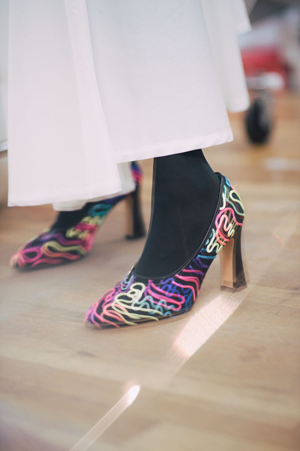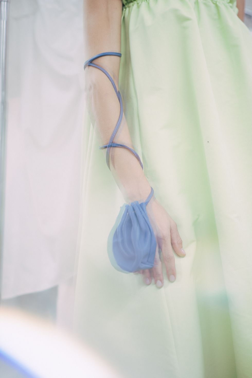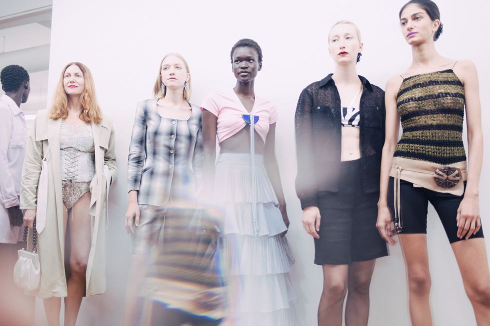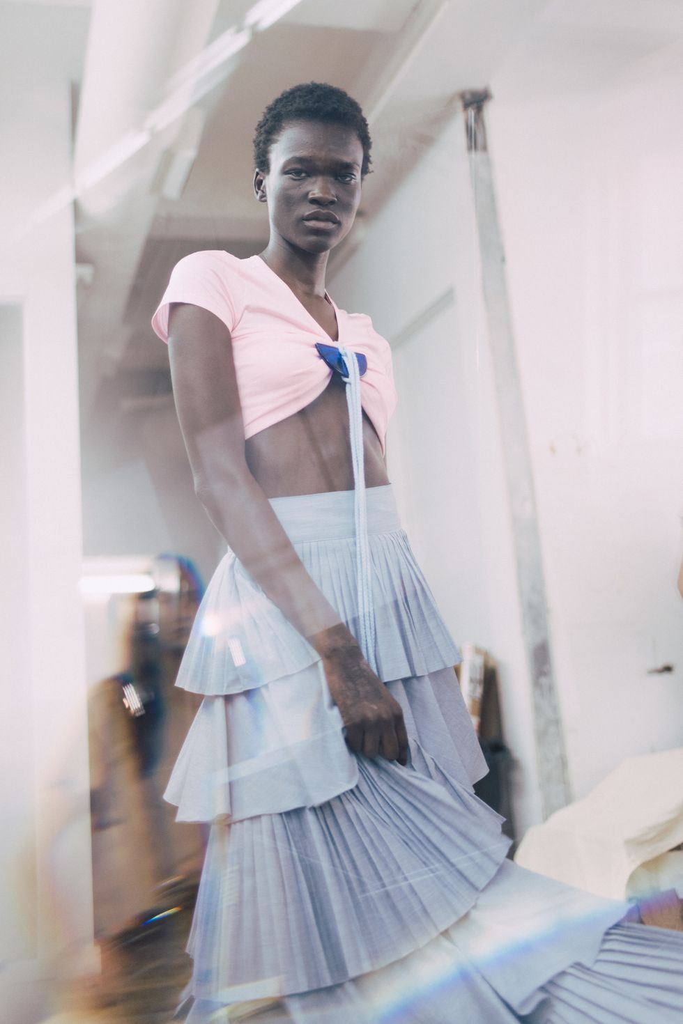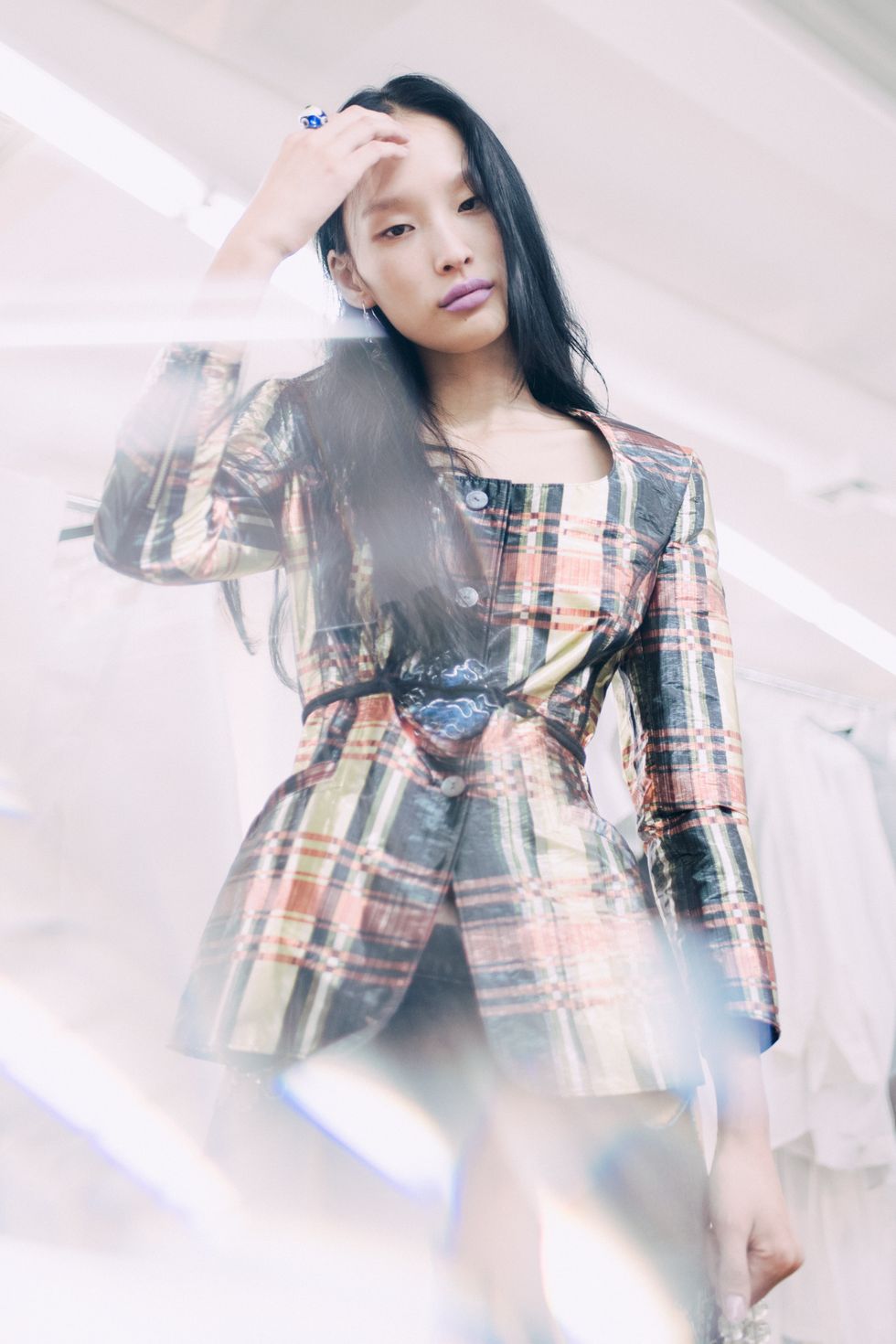 Maryam Nassir Zadeh has a thing for derelict venues. In February, the designer presented her fall collection inside a crumbling gallery space in Midtown Manhattan. This season, Zadeh took over both floors of an old bank building with half-painted walls and imprints of old signage from its days as a Duane Reade. "We did a huge demo at my store and we found something really beautiful underneath," she explains backstage referring to her multi-brand boutique on the Lower East Side. "Some of the best spaces are undone and a bit raw."