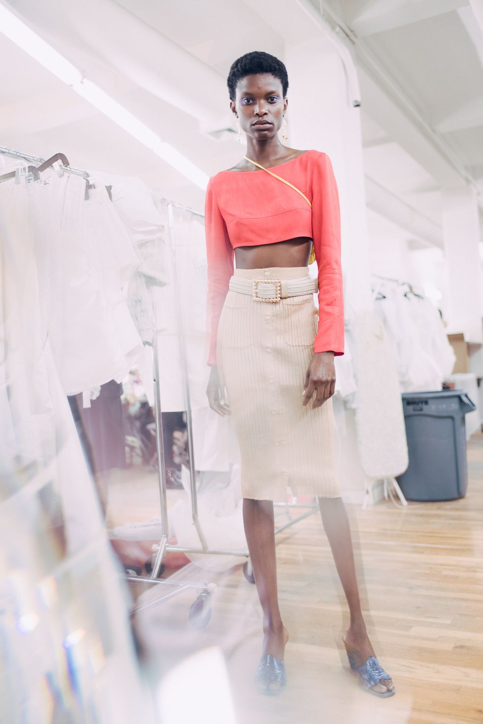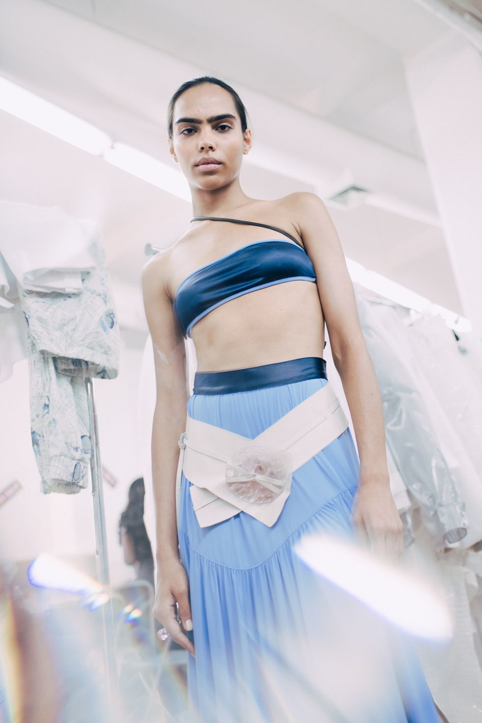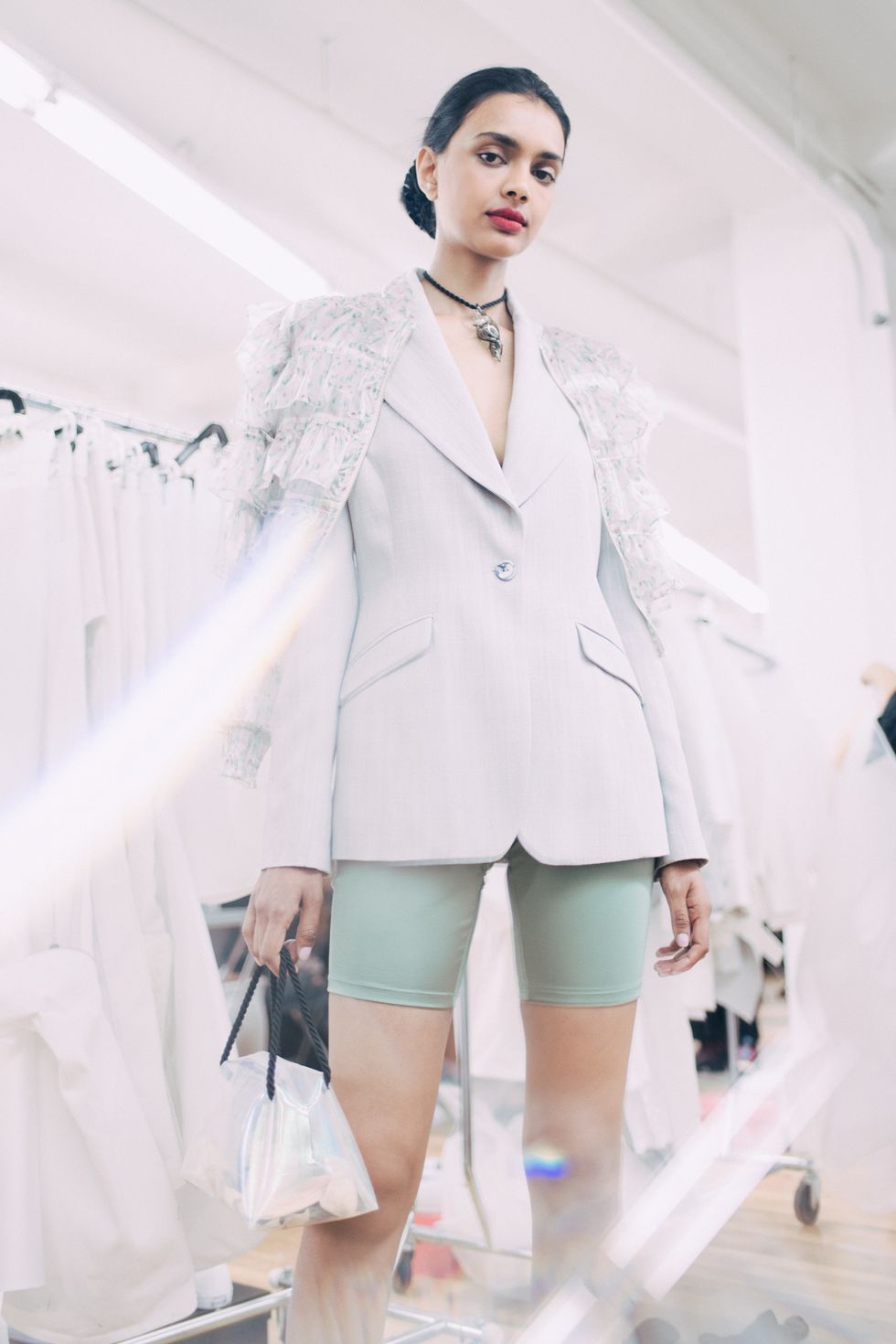 Wide, hip-hugging belts with donut-shaped glass buckles (an extension of Zadeh's signature glass jewelry that stood out among the accessories) sensually contoured bike shorts, blazers, and gathered skirts. "I was inspired by seventies belts which are kind of hard to find," Zadeh says. "When these [belts] came in, they sat a little lower, which felt like a new proportion."