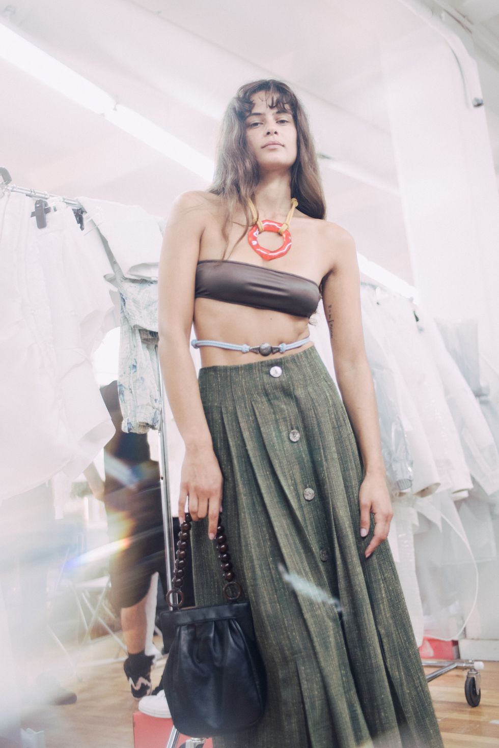Zadeh has spent the past summer vacationing along the Mediterranean, all the while mixing swimsuits with daywear. That beach-ready look appeared in the collection courtesy of her runway stylist Haley Wollens: bikini tops and one-piece swimsuits were styled with trench coats, under loose button-downs, over t-shirts, and with maxi skirts.