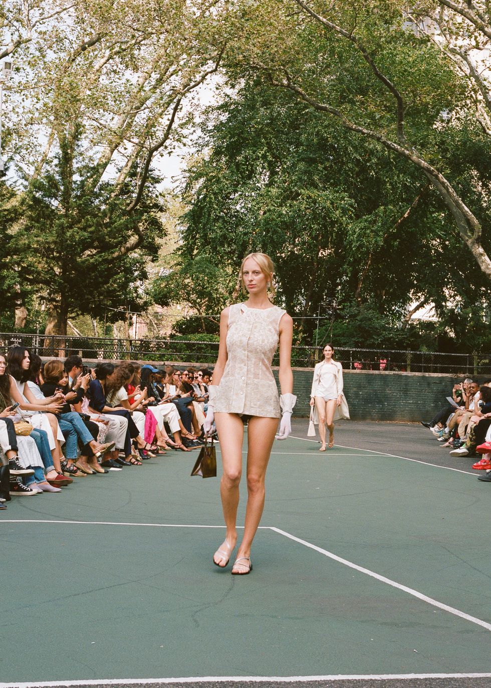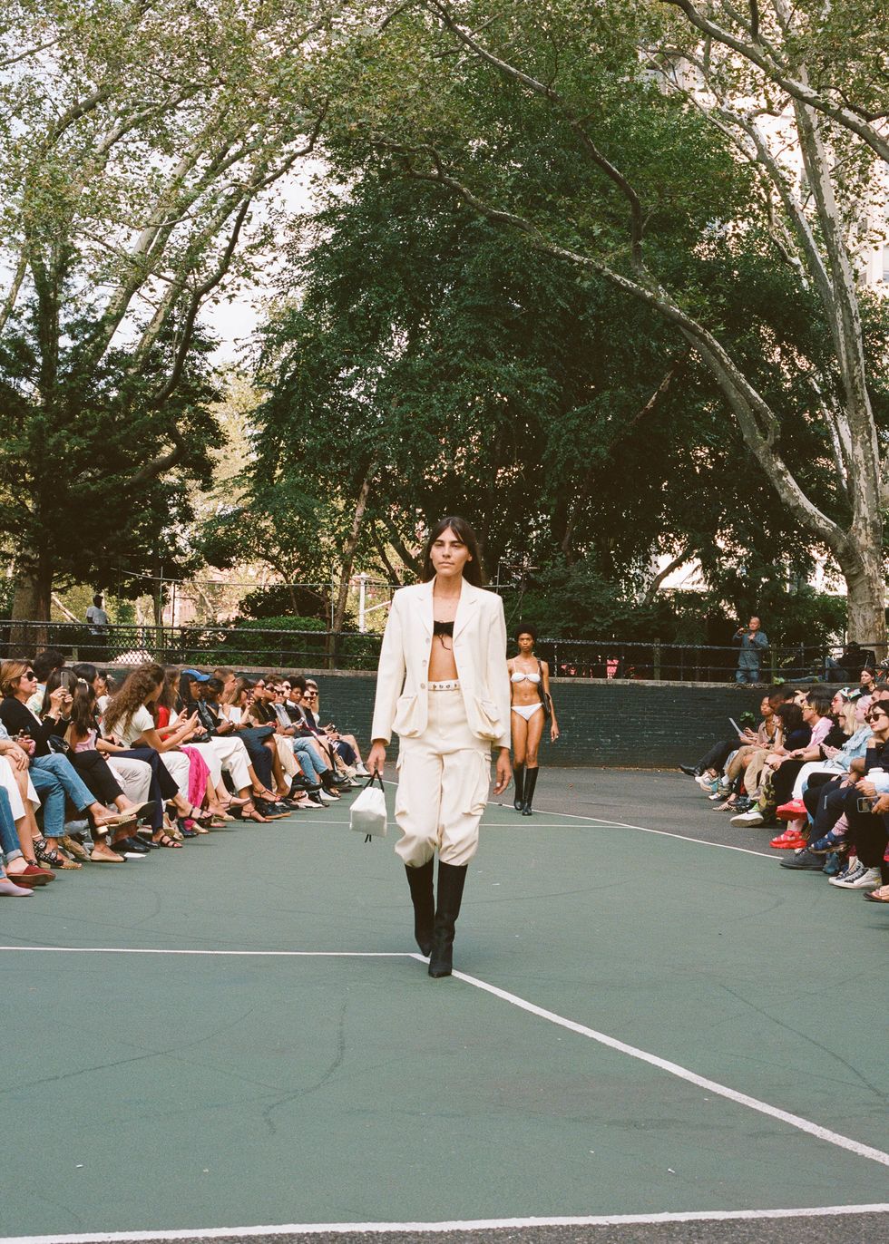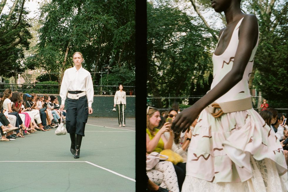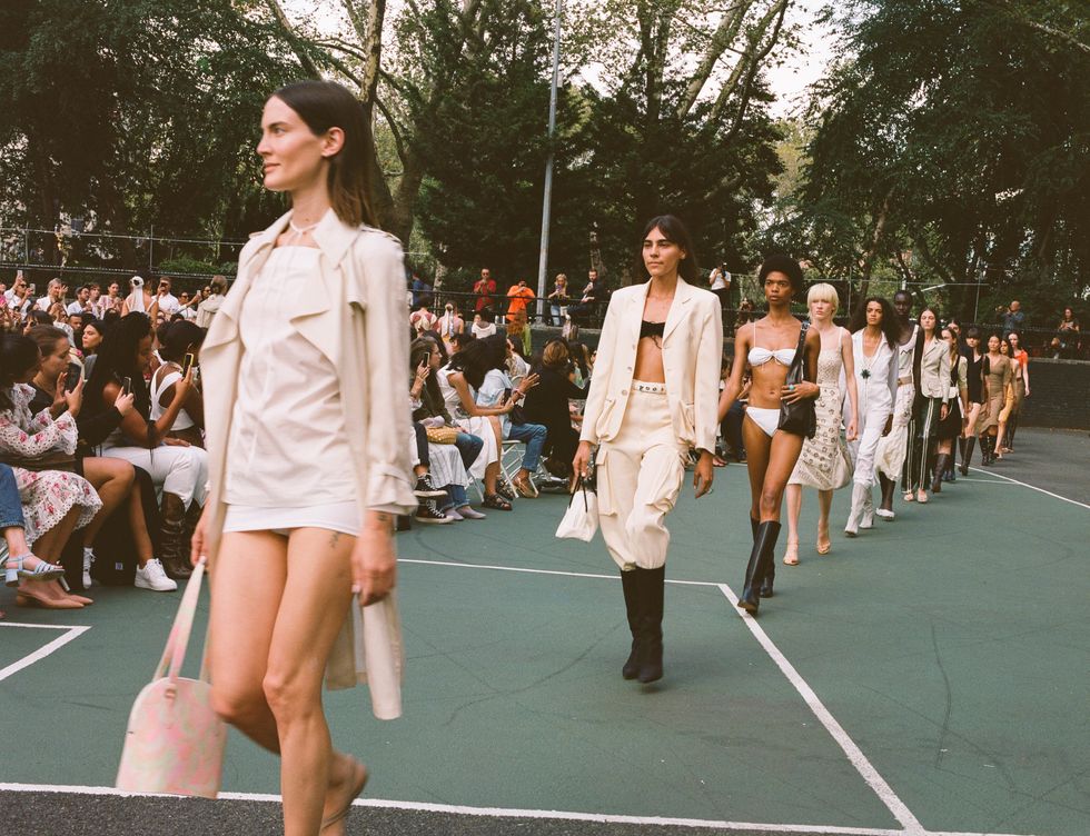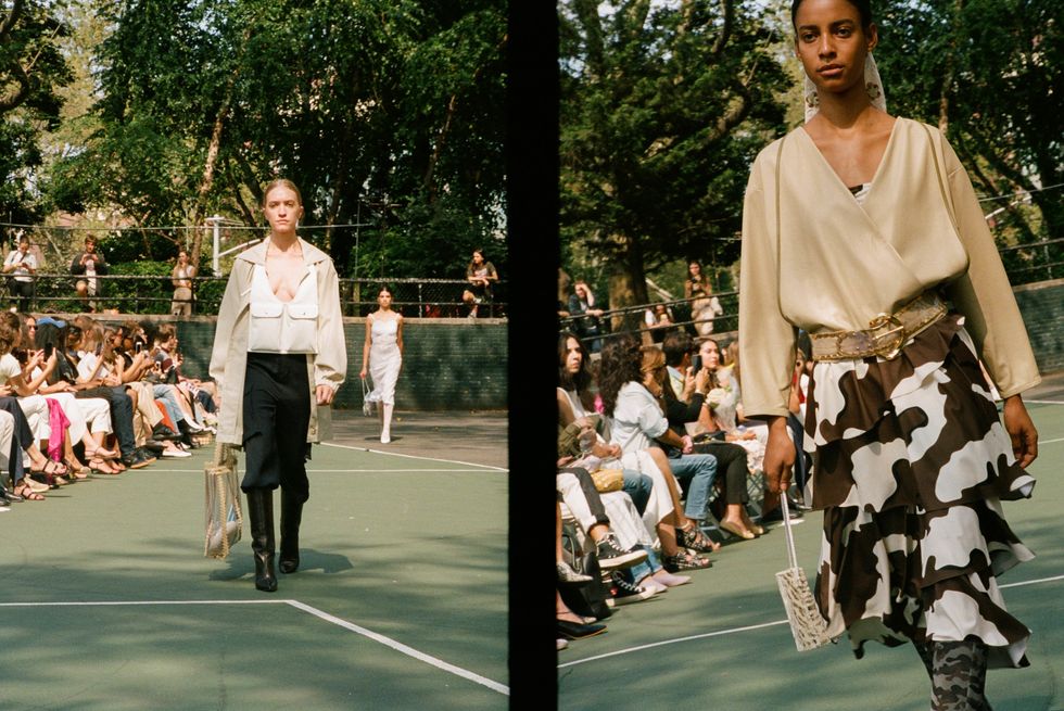 Chief downtown trendsetter Maryam Nassir Zadeh described her Spring 2020 collection to me as "'90s mod, Cassavetes city girl, beach rave, safari suiting," which is such an apt description that it feels foolish to expand upon it any further. Her show, held on Monday at Sara Delano Roosevelt park on the Lower East Side, was so soothing — the vacation colors, the fresh air, the presence of dogs and small children — as is the MNZ way. Everyone just looked so fresh and happy. The women of Dimes Square all clamored for seats.