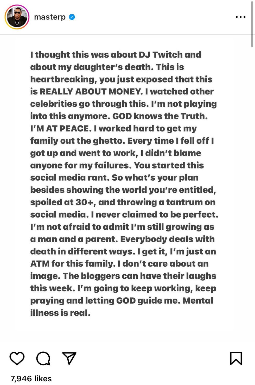 "I thought this was about DJ Twitch and about my daughter's death," the post reads. "This is heartbreaking, you just exposed that this is REALLY ABOUT MONEY." He further goes on to diss his son, saying, "So what's your plan besides showing the world you're entitled, spoiled at 30+, and throwing a tantrum on social media."