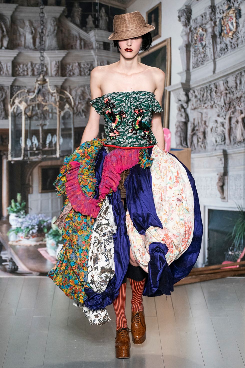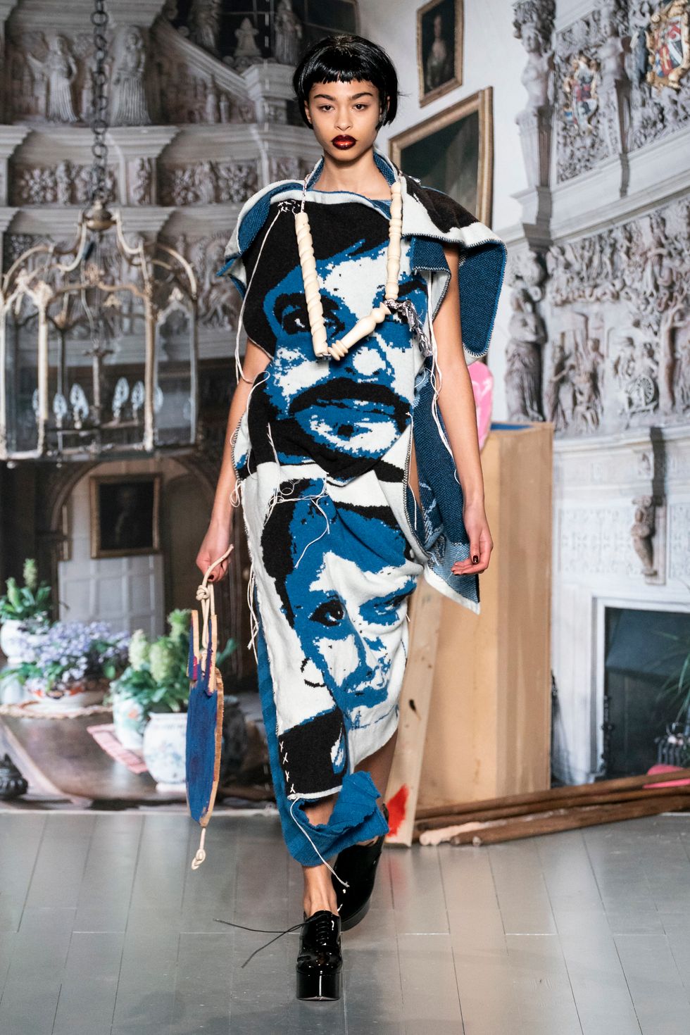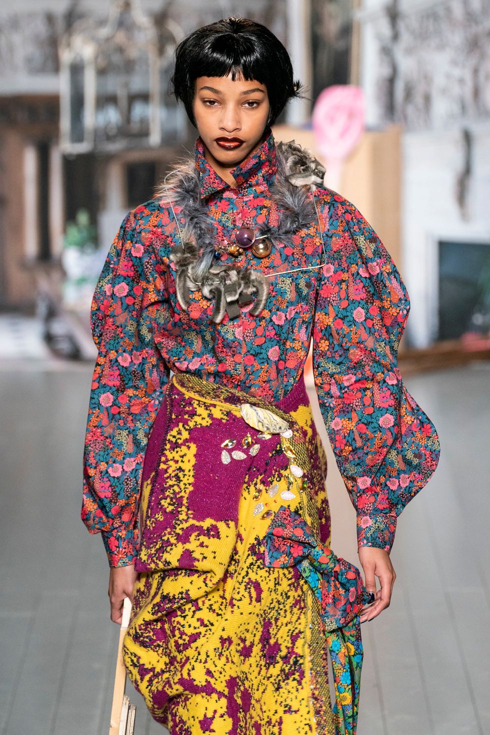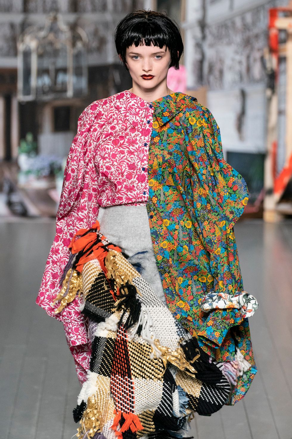 There was an overwhelming amount of mixed prints in Matty Bovan's fall 2019 collection. Nearly every surface seemed to be covered in baby floral patterns, abstract motifs, faces and logos (more on that later) than paired together for a visual collage of eccentric style.
