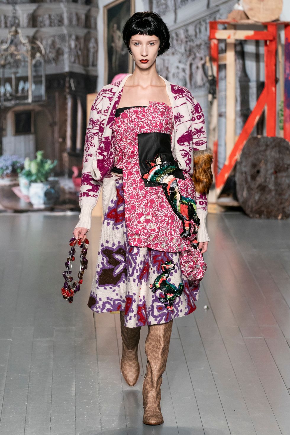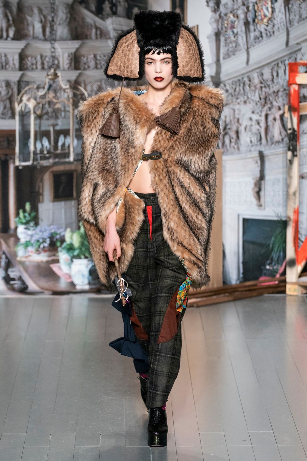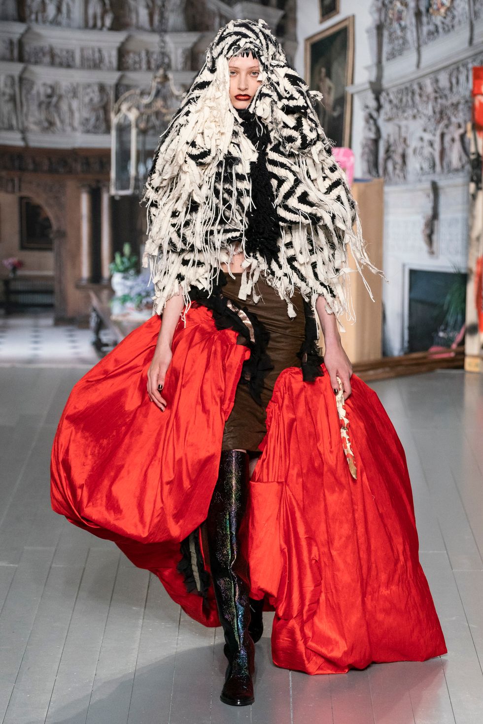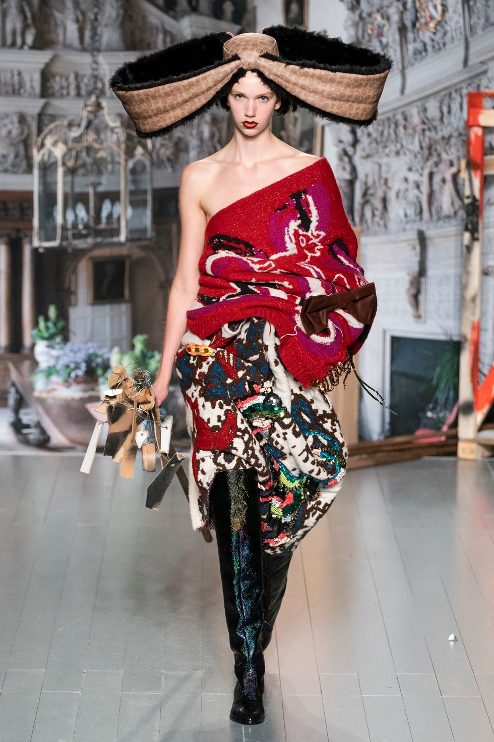There was an overwhelming amount of mixed prints in Matty Bovan's fall 2019 collection. Nearly every surface seemed to be covered in baby floral patterns, abstract motifs, faces and logos (more on that later) than paired together for a visual collage of eccentric style.