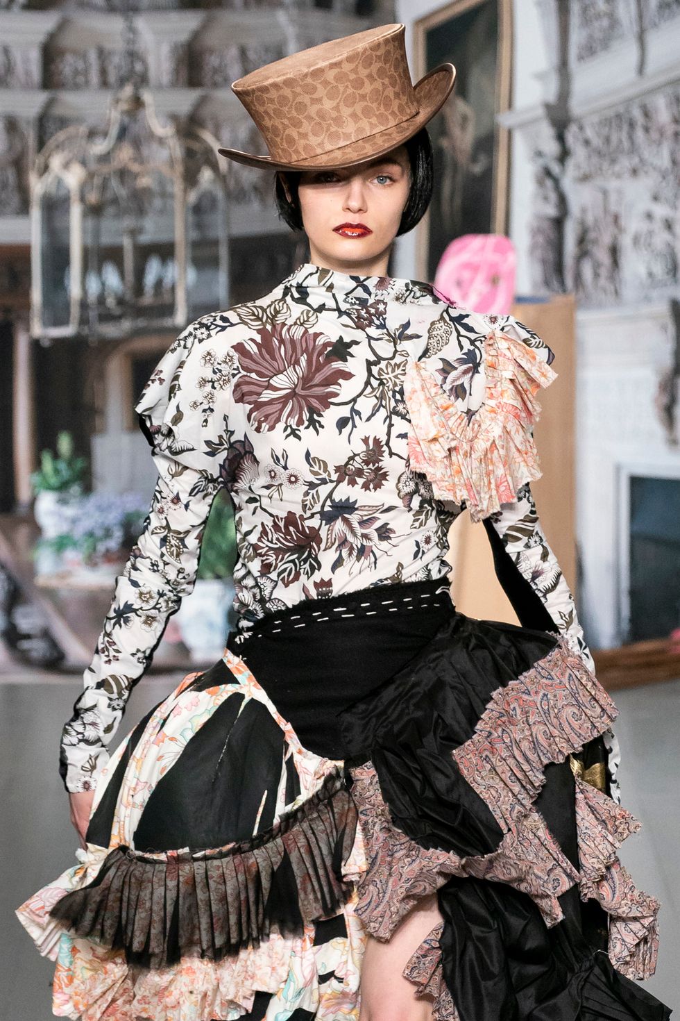 Another collaboration within the collection? Coach x Matty Bovan. The designer used the phrase "hats through the ages" for the reference point, and Jones worked with Coach's signature logo print when creating the toppers.