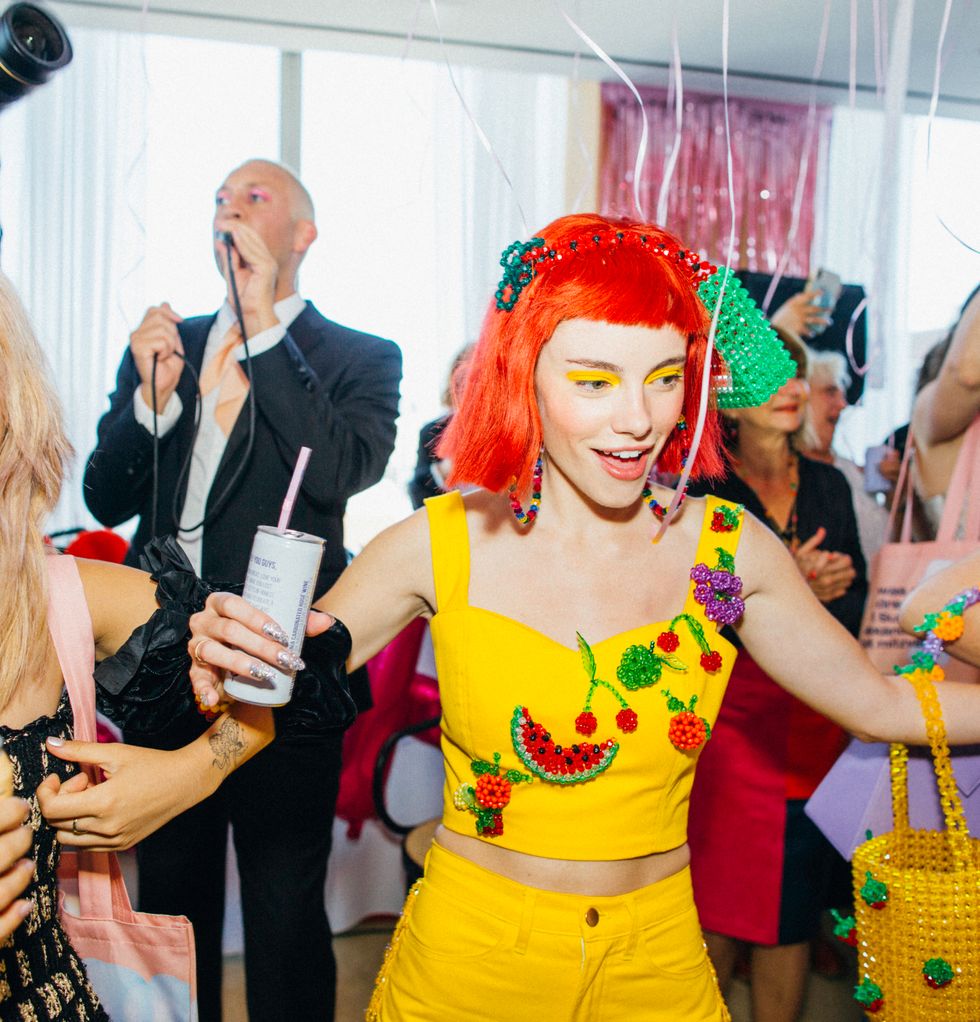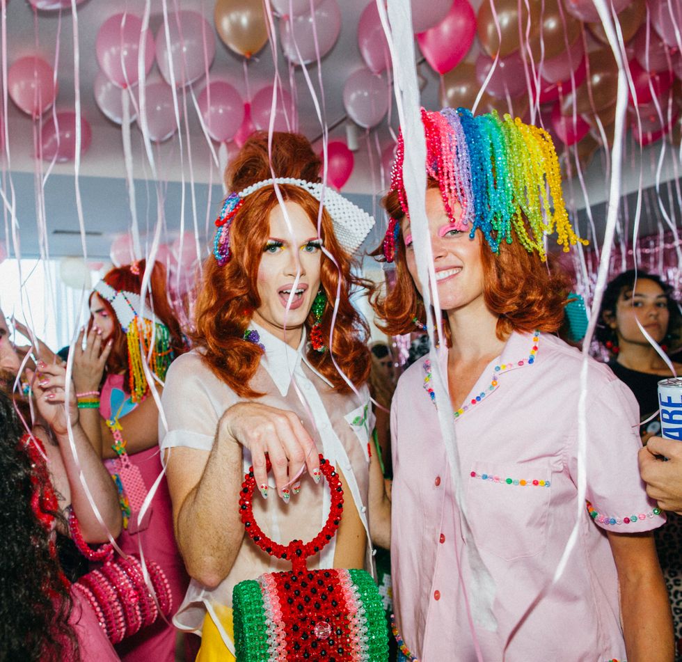 Models at fashion presentations tend to look more than a little tortured — they traditionally have to stand in heels for ages, the pain palpable on their faces (the heels at Susan Alexandra came courtesy of Dolce Vita). But the Susan Alexandra models got to mingle and dance, having a better time than anybody else. They wore big red wigs and headdresses incorporating the famous purses. And Korn's casting could not have been better — the presentation featured comedians like Benny Drama, Cat Cohen, and Lauren Servideo; photographer Hunter Abrams; drag performer and frequent Susan Alexandra collaborator Steak Diane; influential hairstylist and Vacancy Project salon owner Masami Hosono; and writers like New York Times editor Jazmine Hughes and widely-beloved New Yorker staffer Naomi Fry.