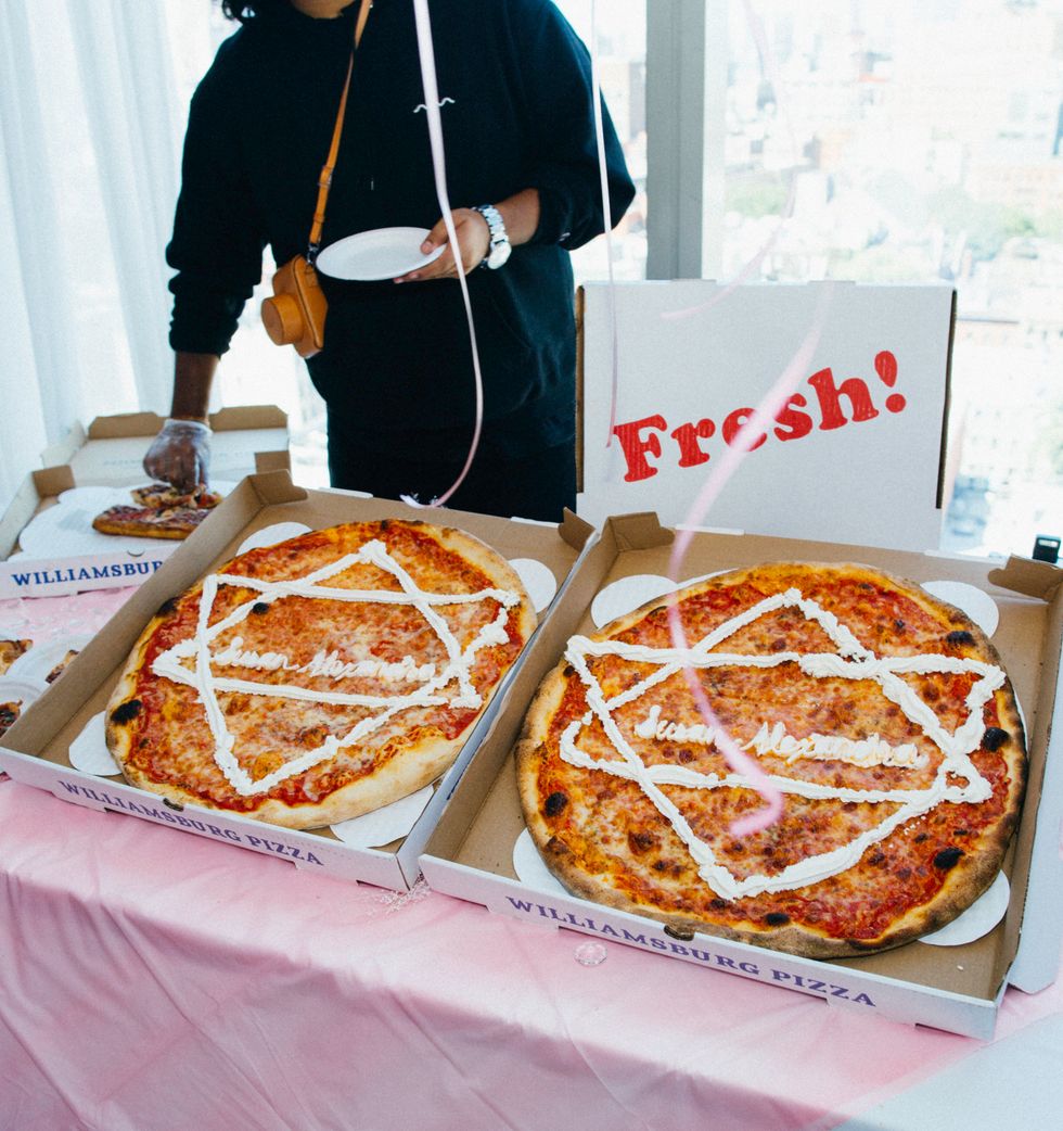 The presentation just made people so happy. It was full of pointed signals to New York Jewish culture: a tower of Dr. Brown's Cel-Ray soda with a photo of Mike Myers' in drag as his seminal SNL character Linda Richman; bagels from Baz, where Korn held her last presentation; schmaltz-y popcorn; beaded yarmulkes (activist Adam Eli was dressed as a rabbi); a pie from Williamsburg Pizza embellished with a ricotta Star of David. Korn's models even hoisted her in a chair for the horah.