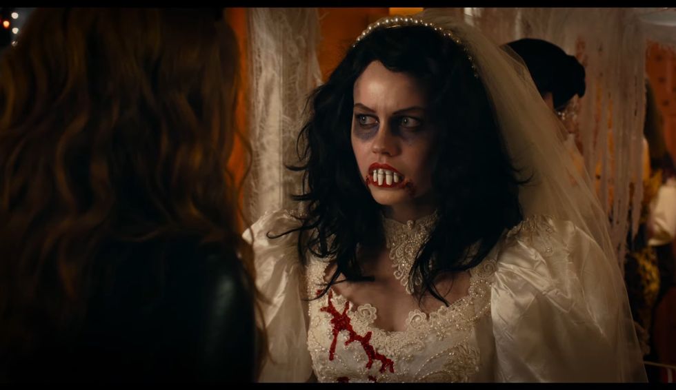 By comparison, the trailer is chock full of references to prior outfits from the original and the costumes worn in the musical. Sure, Regina George’s pink miniskirt and cardigan combo is downright legendary. At times, Rapp’s Regina edges close to dazzling like the original — particularly the Gaultier-inspired mesh top and exposed corset — but the cast around her fails to make a similar impression. Jaquel Spivey and Auli'i Cravalho’s costumes as alt duo Janis and Damian are almost direct parallels to what those characters wore in the original. Cady even revives the exact same spooky “ex-wife” costume from the Halloween party, fake teeth and all.