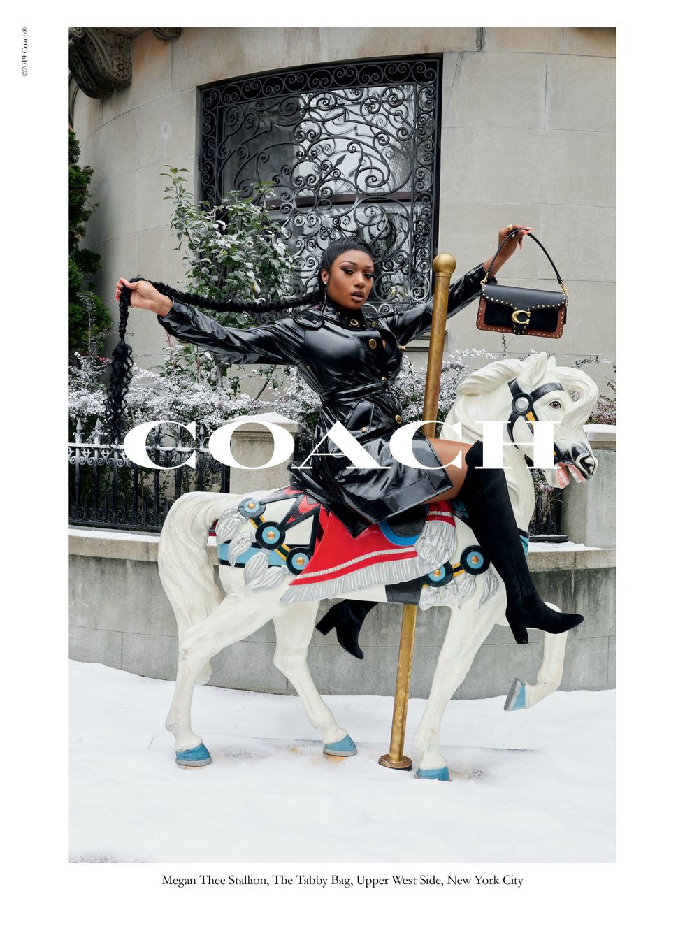 In the Juergen Teller-lensed photos, Megan is giving us Hot Girl Winter against a snowy backdrop complete with a horse (naturally) in front of a New York City brownstone. The rapper wears a black leather coat dress, knee-high boots, and a seriously long braided ponytail while holding the $395 Tabby shoulder bag with C logo clasp.