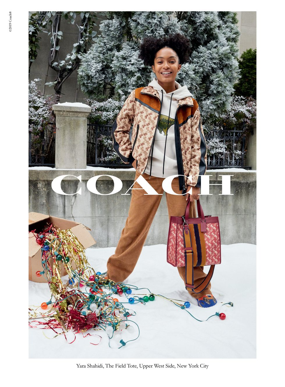 The images are part of Coach's "Holiday for All" campaign, whose cast also includes Yara Shahidi, Kate Moss, Fernanda Ly, and Miles Heizer. It also introduces the brand's new Horse and Carriage collection, seen on Moss and a new version of the Kat Saddle Bag, which is a modern update on its classic horse and carriage motif from the '50s.