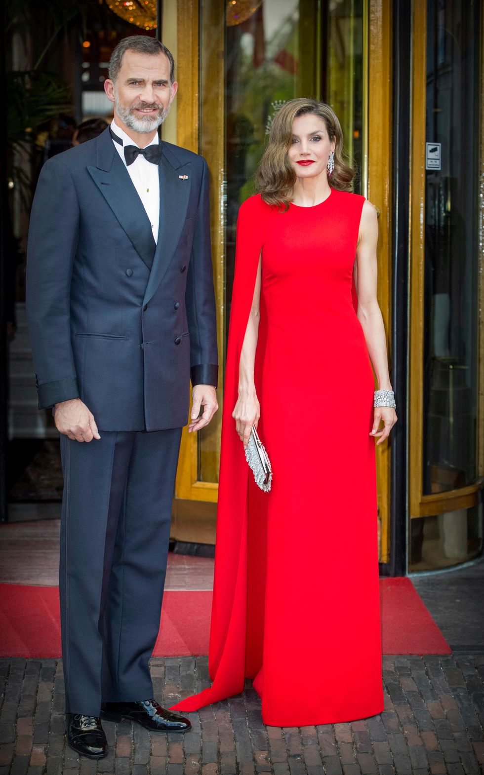 Queen Letizia in a Stella McCartney asymmetrical cape dress at the King of Holland's 50th birthday celebration in April 2017.