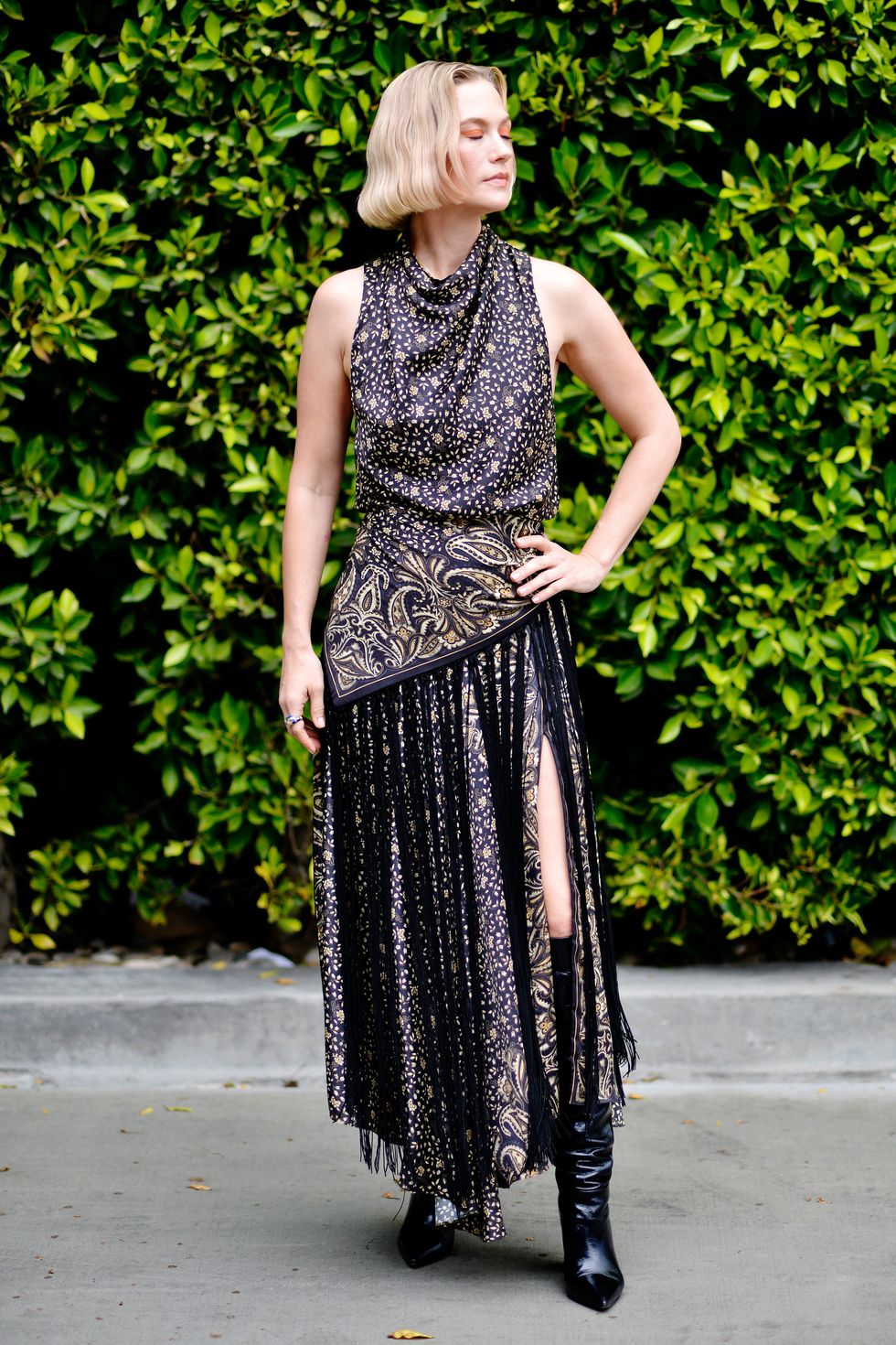 The Mad Men star paired her floral and fringed Fall 2020 Jonathan Simkhai dress with leather knee-high boots to a charity event in LA.