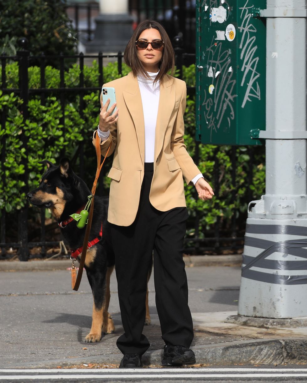 The model and designer sets the bar high for dog-walking street style in this camel Givenchy blazer, white turtleneck and black trousers on a sunny day in New York.