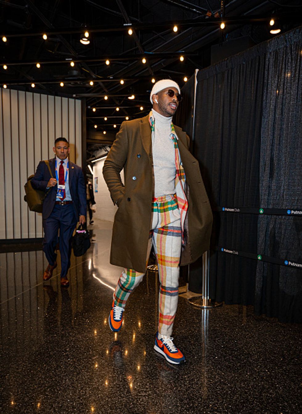 The NBA star sported a colorful tartan shirt and matching trousers by LA-based brand The Elder Statesman at Madison Square Garden in NYC.