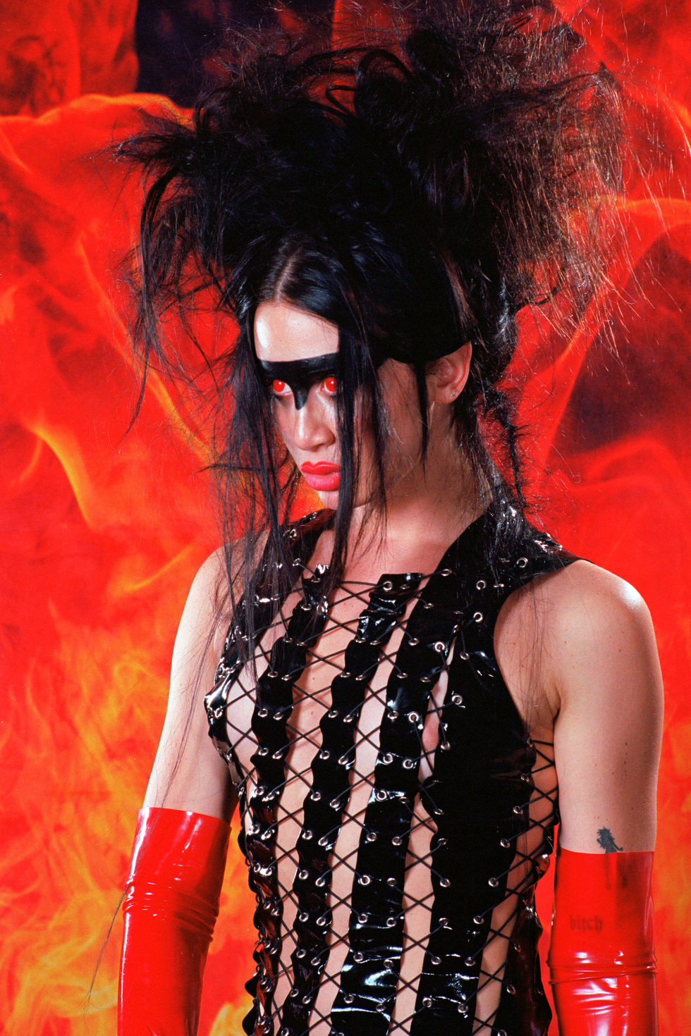 Mask, top and skirt: Busted Brand, Collar: Zana Bayne, Coat: Meli