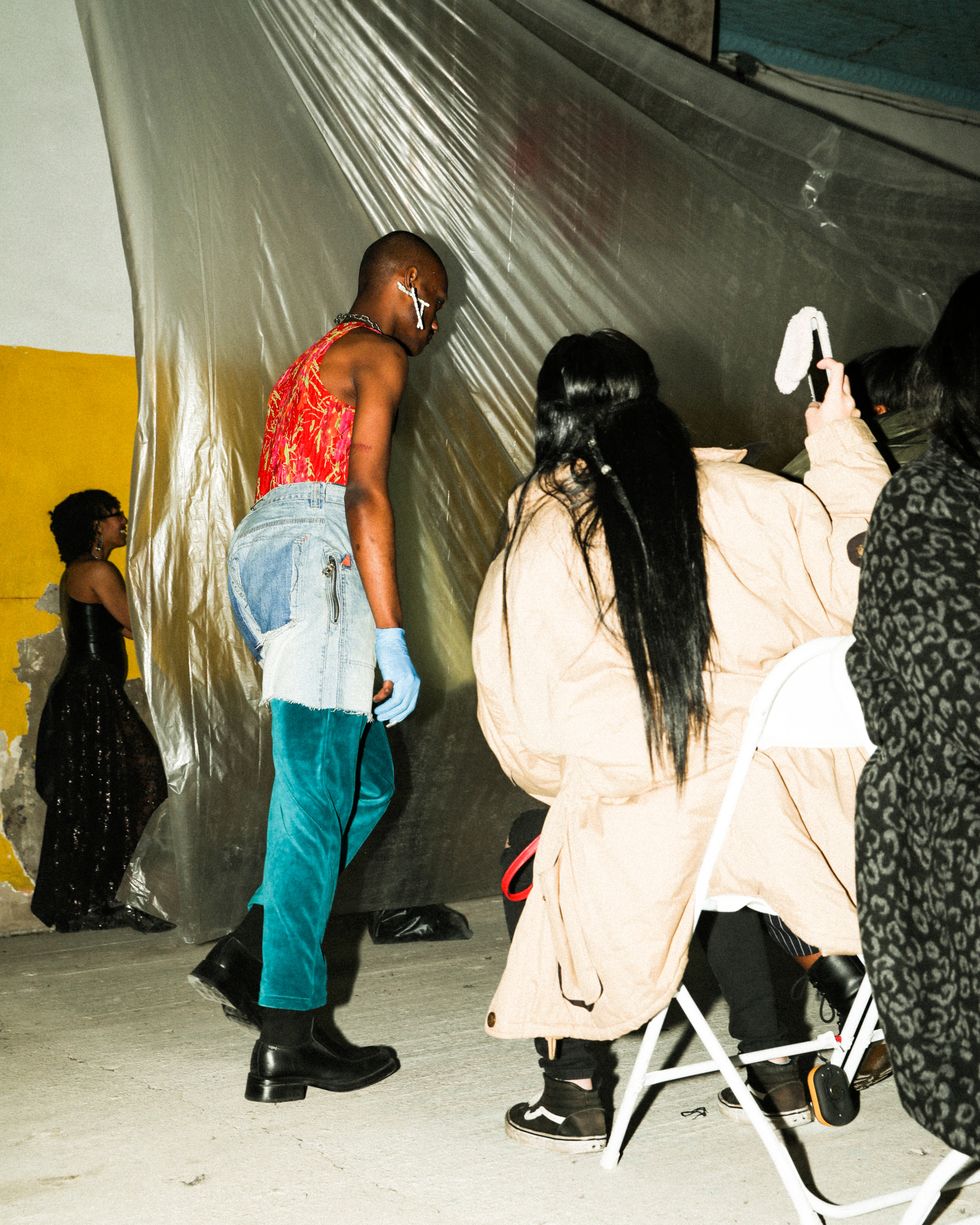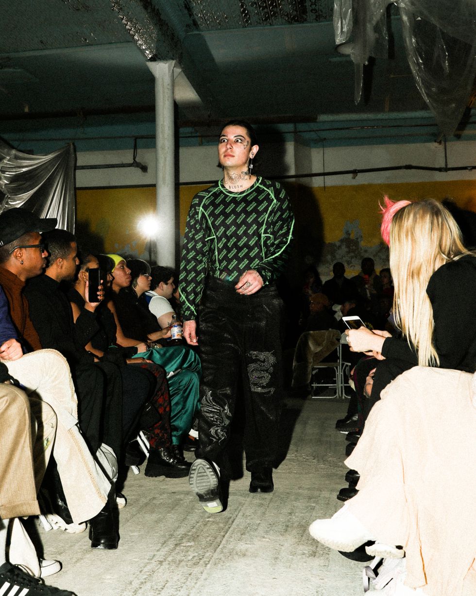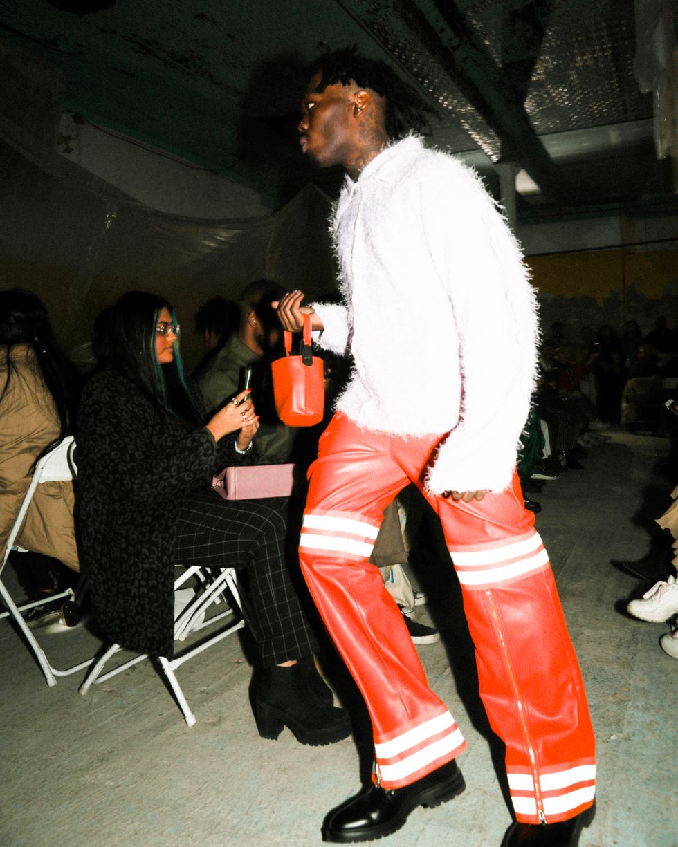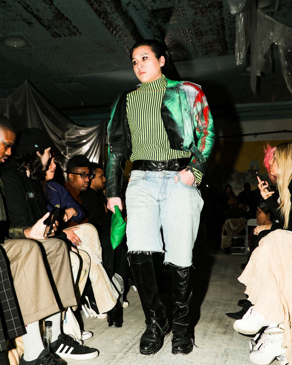 "For this year's collection, I wanted [it] to be reminiscent of the kinds of people I would see going to my favorite [Brooklyn] techno clubs on Broadway and Myrtle, wearing shiny trashbag-like bottoms with tight tops," he explains. And as for casting, Rose broke away from his usual method of finding models on Instagram, and cast people on the street and subway who caught his attention.