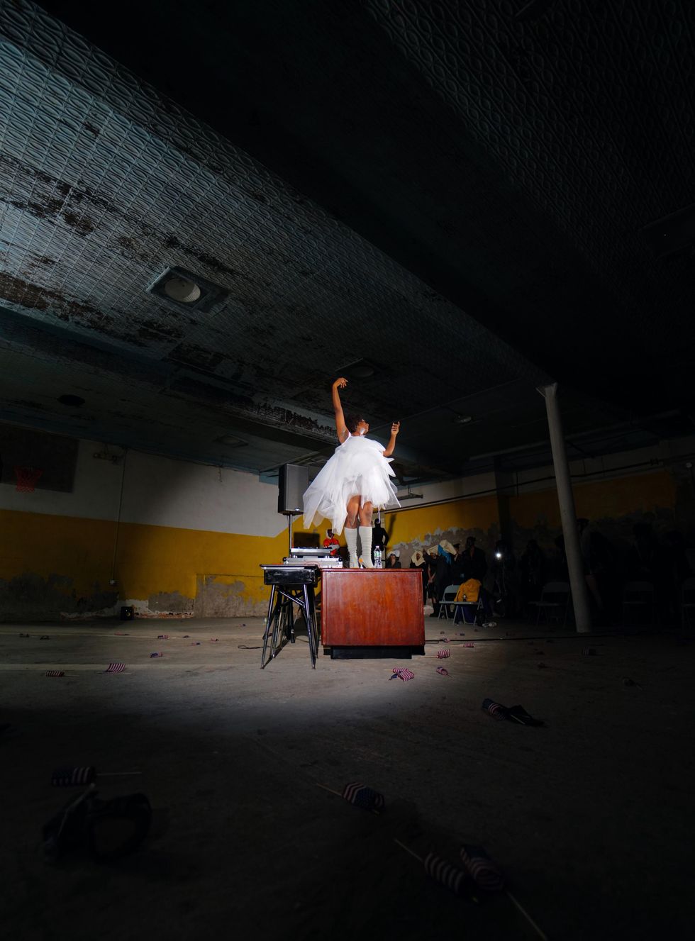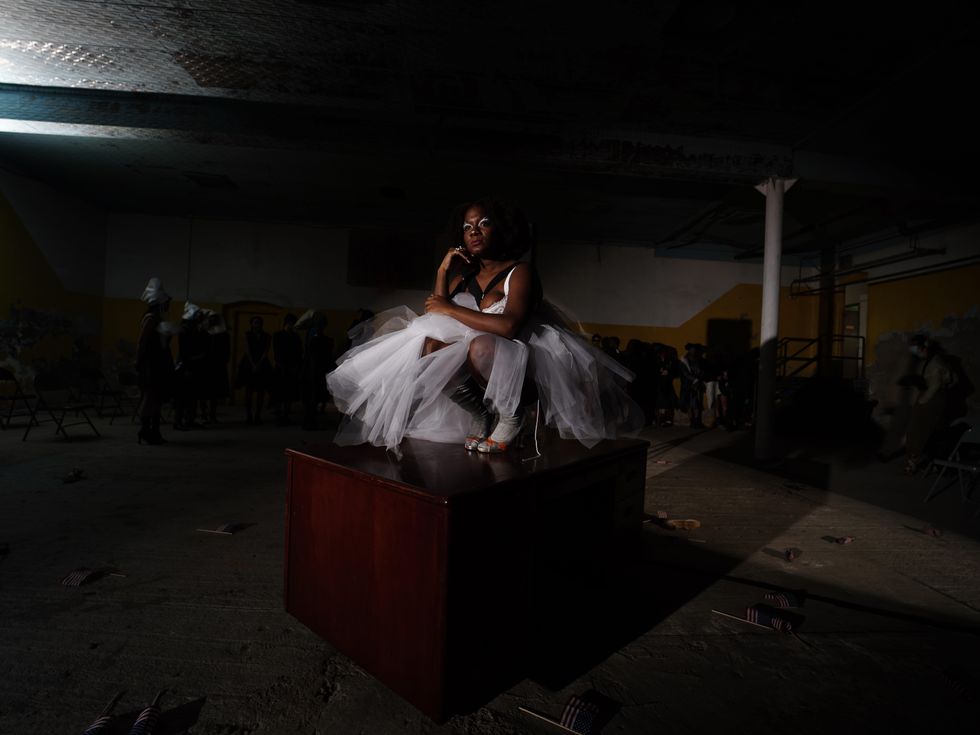 His socially distanced show on Saturday night opened with his twin sister, Makeda Rose, standing atop a table in the middle of the room, singing Rachmaninoff's "Vocalise" in a high, classical, angelic soprano. When she finished, she fell and a darkness came over the runway.