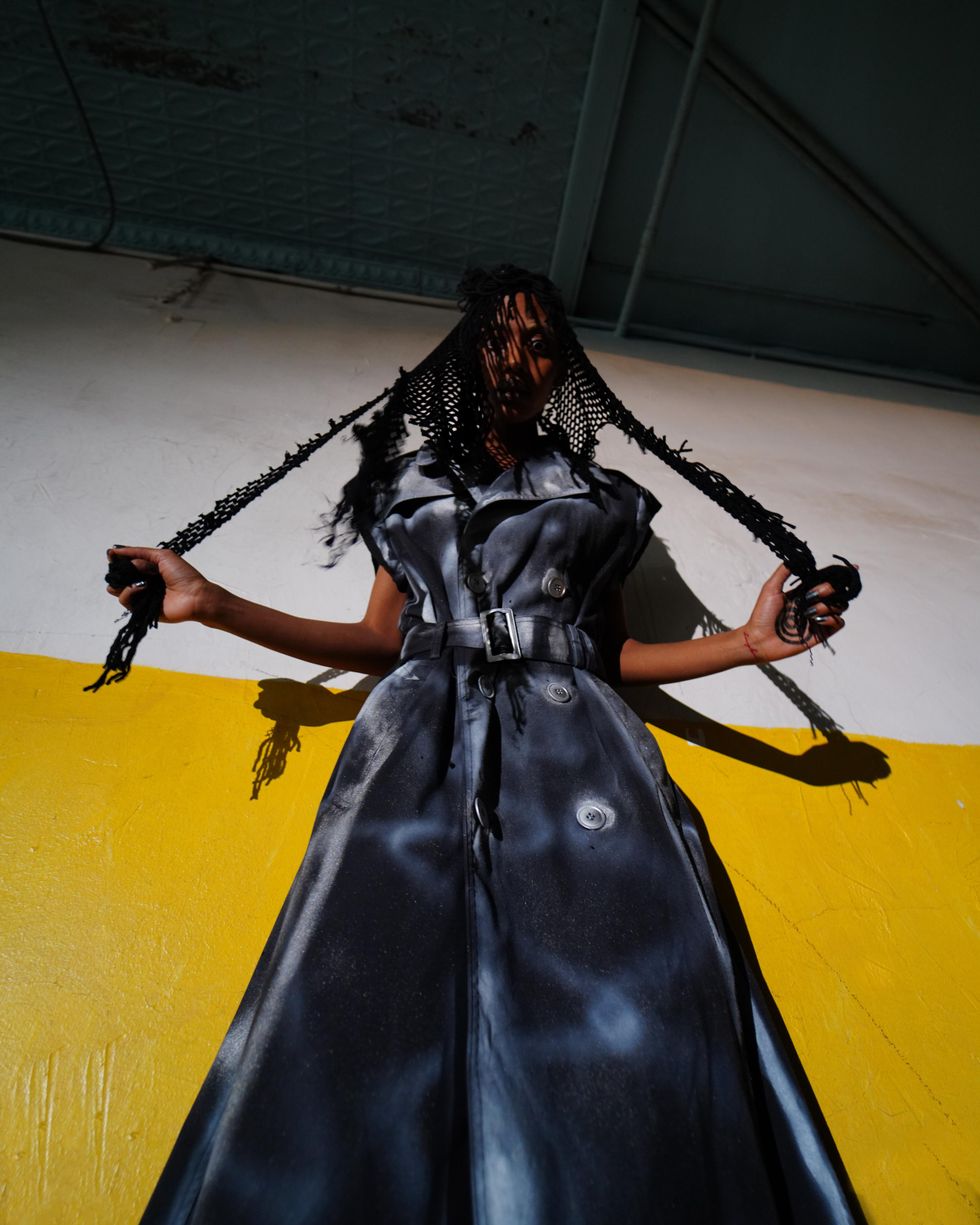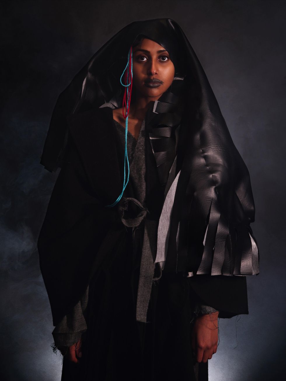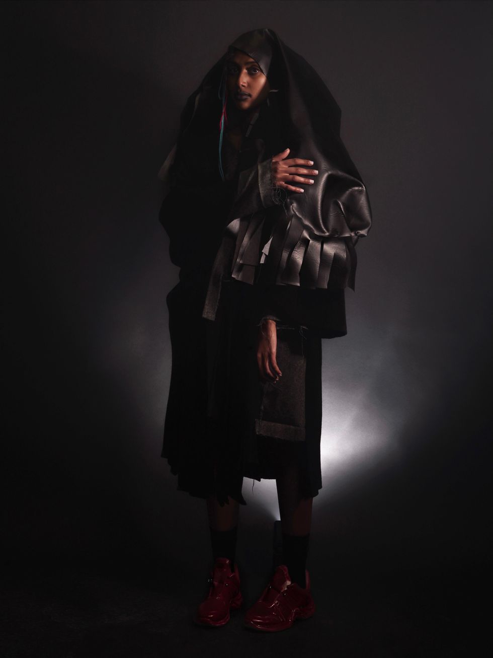 "I wanted to create these bold shapes and cutting slits on the shoulder of and trench coat and cutting holes in the arm for an open elbow allowing the person wearing many options to wear it," Menyelek said.