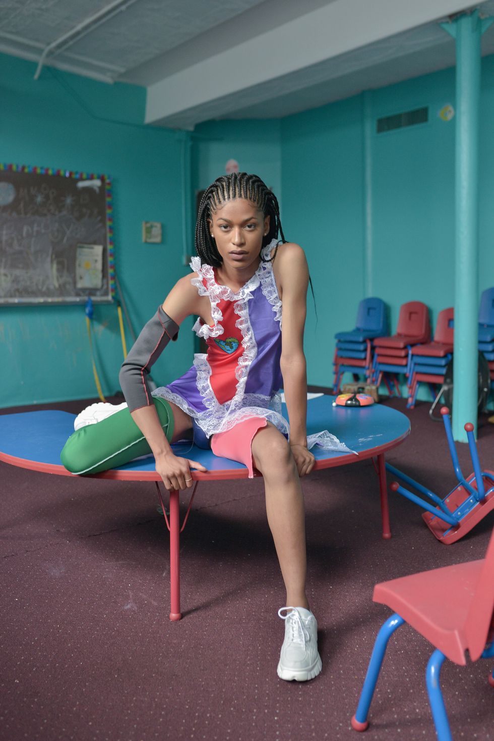 To see how these ideas connect, Rose felt it best to watch them move, literally. The presentation took place in a church's dilapidated Bushwick, Brooklyn basketball court from the 1940s, styling "hyper-masculine females" in "hyper-feminine couture gown dresses," according to Rose.
