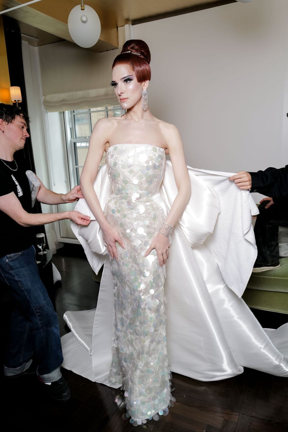 In the days after I received the sketch, I scoured Tumblr and my bookshelf for references. Things really locked into place when I revisited Frank Simon’s 1968 documentary The Queen, which goes behind the scenes of a drag pageant. I was inspired by how these queens interpreted the glamor of the ’50s from the social fringes of the ’60s. It was all about feathers and jewels and shine — glamor which requires no subtitle. Big hair and heavy paint! At the end of the doc, there’s this amazing scorched-earth speech by the gorgeous Crystal Labeija, who felt marginalized even within the drag circuit and went on to form the House of Labeija, which was foundational to the ballroom scene as we know it. I’ll be thinking about Crystal tomorrow. Sampling these aesthetics of the past from my perch in the new world, while also acknowledging the legacy of the queens who paved the way and did it before me — it all felt correct. This interplay and tension between the past and the future felt, to me, on-theme. It felt like an invitation to embody classic glamor in a way I usually avoid.Very Hollywood, very Barbie. I usually wear black, and this is white. I favor harder silhouettes and unconventional materials, where this is soft and grand. But I was up for the challenge.You're coming off such a successful year professionally with Barbie and the announcement of the Candy Darling biopic. I think it's really cool that this is such an important night in fashion, and you're getting to go into it with so much more peace than maybe you did the first time. I think that that's really, really exciting.