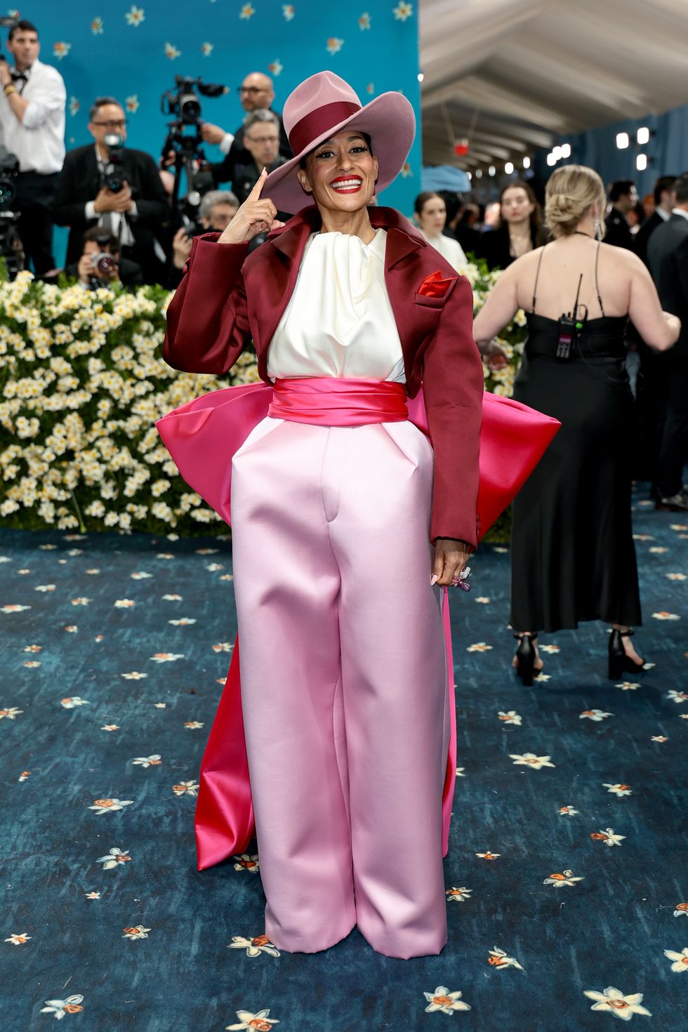 Speaking of statement hats and and stunt tailoring, here’s Tracee in Marc Jacobs. The pops of mahogany were, to me, a deeply impactful nod to her mother’s own legacy with Mahogany.