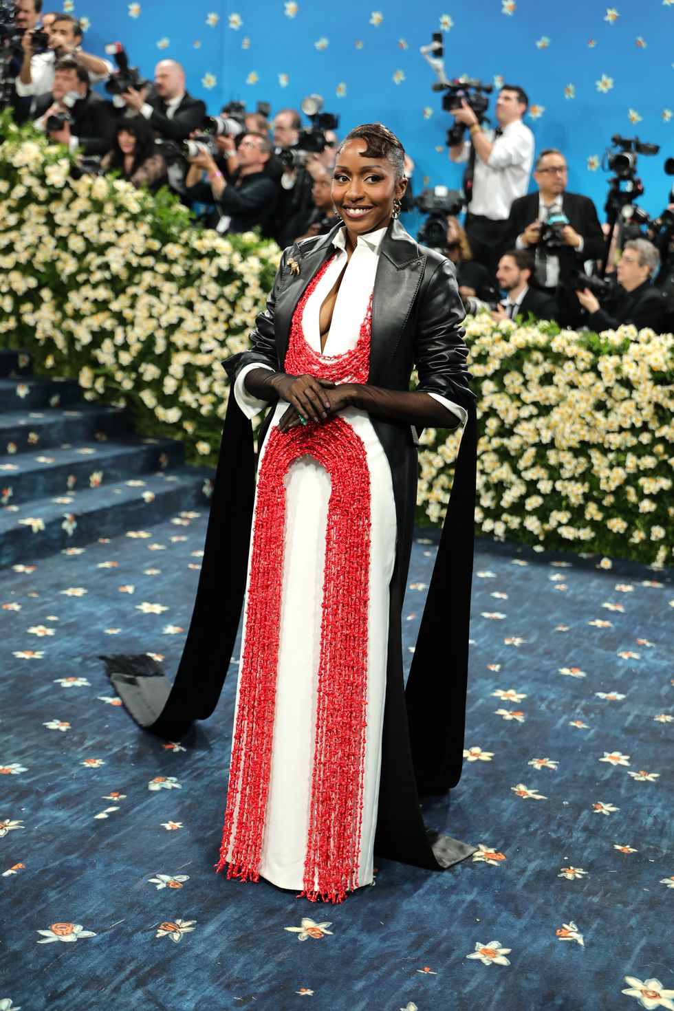 Thank god for Ferragamo creative director Maximilian Davis, the beautiful mind behind Edebiri’s knockout look from the night. As she told Vogue, the inspiration for the look came from her dad: “He's one of the dandiest men I know, whether he’s power-clashing to go to the office, or in traditional Edo clothes at the Emmys with me. He got married to my mom in leather trousers and tuxedo tails, which is pretty iconic.”