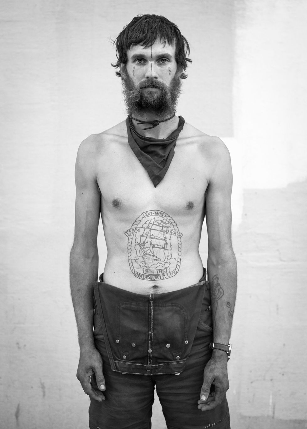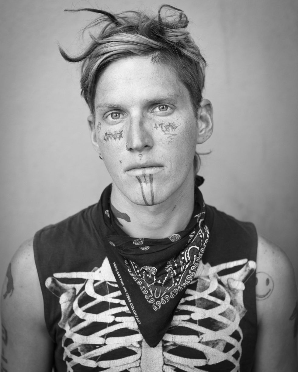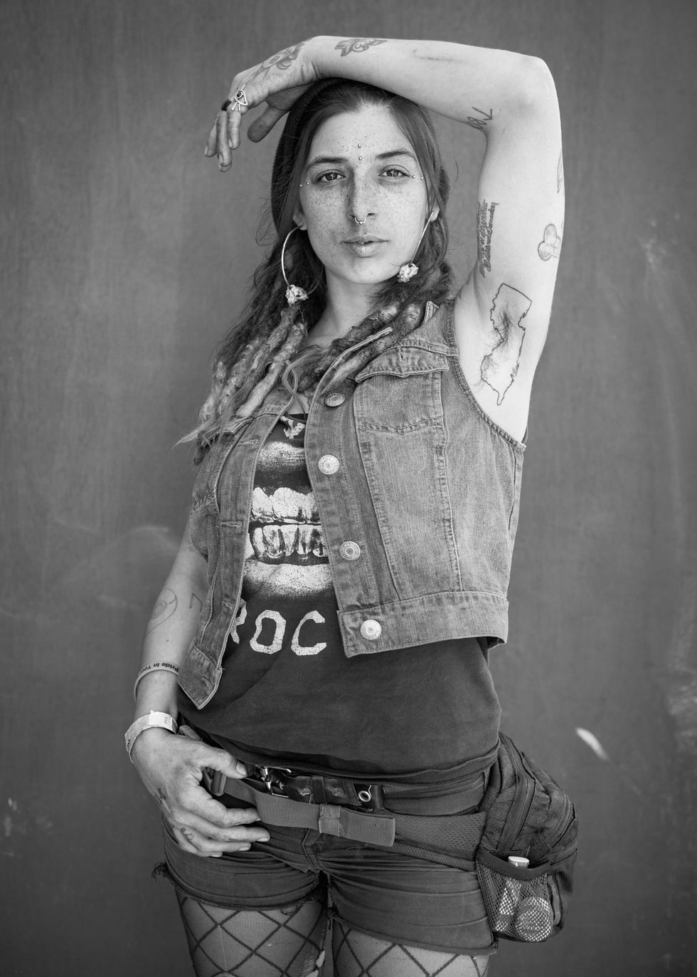 Rather than the blurry YouTube footage or dark polaroids typical of punk memorabilia, the photos are exhilaratingly detailed. The figures are rarely smiling but make unyielding eye contact with the camera. The close-ups allow the viewer to see beyond spectacle or curiosity, and admire the clues the photos offer about the subject's stories and journeys. One man's glasses balance on his nose without arms. Another's jacket is embroidered with what look like bird bones. A woman drapes her arm over her head to reveal a line drawing of New Jersey on her armpit. A tattoo on one subject's stomach reads, "Do not fear death, but the inadequate life." Anarchist and squatters rights motifs are common.