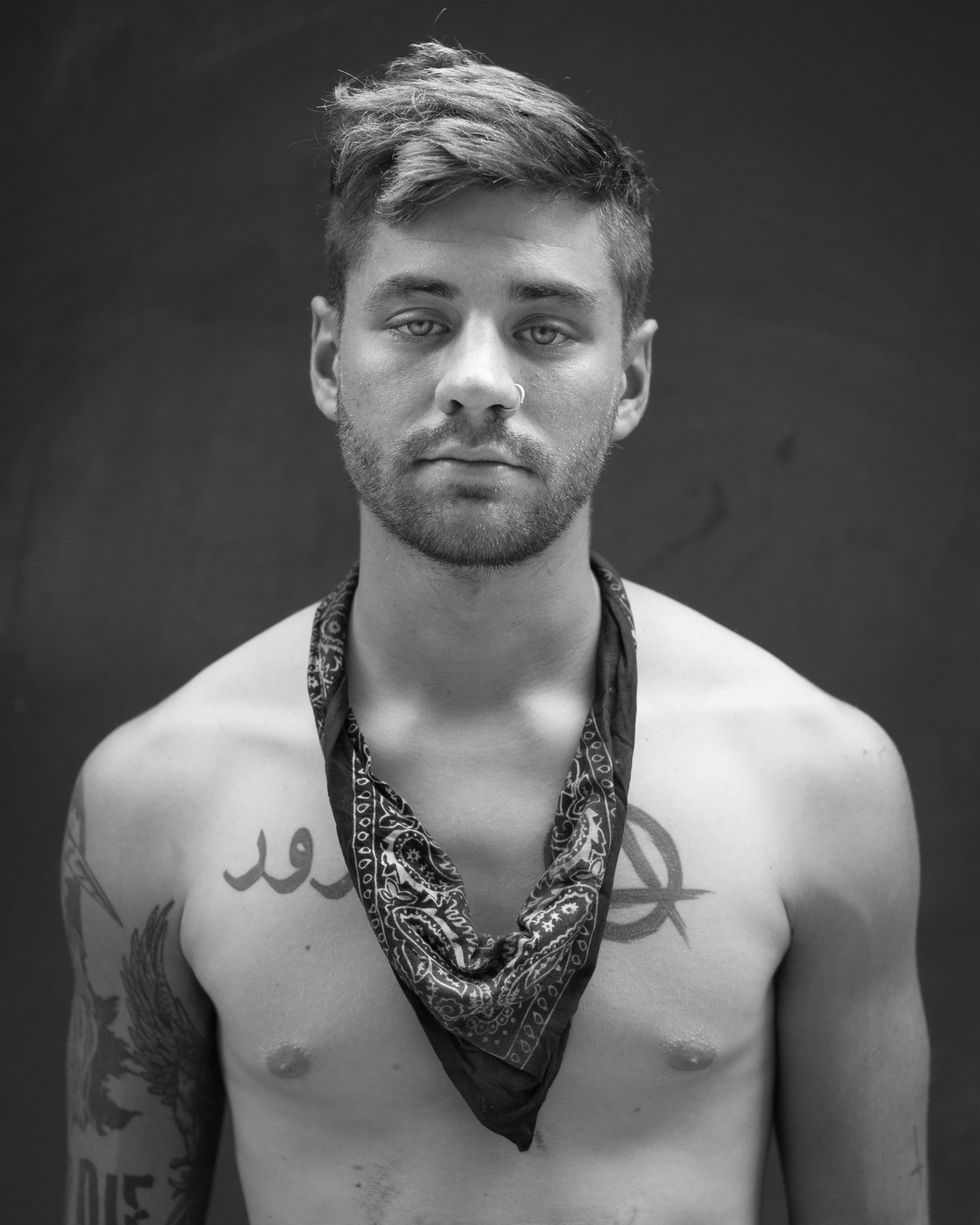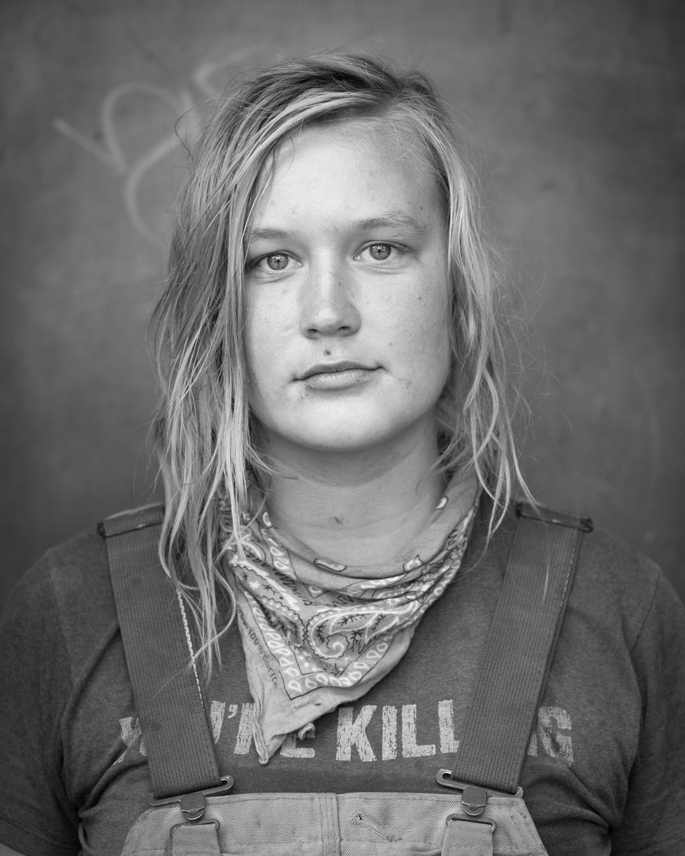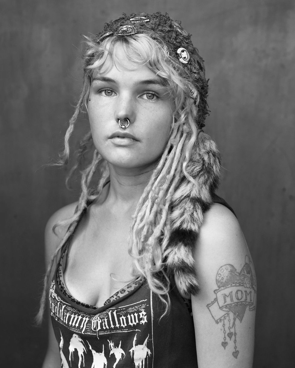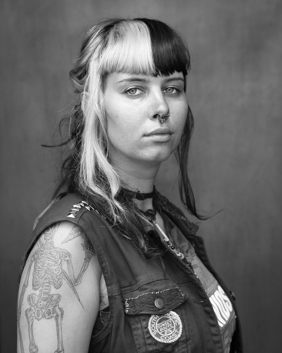 Rather than the blurry YouTube footage or dark polaroids typical of punk memorabilia, the photos are exhilaratingly detailed. The figures are rarely smiling but make unyielding eye contact with the camera. The close-ups allow the viewer to see beyond spectacle or curiosity, and admire the clues the photos offer about the subject's stories and journeys. One man's glasses balance on his nose without arms. Another's jacket is embroidered with what look like bird bones. A woman drapes her arm over her head to reveal a line drawing of New Jersey on her armpit. A tattoo on one subject's stomach reads, "Do not fear death, but the inadequate life." Anarchist and squatters rights motifs are common.