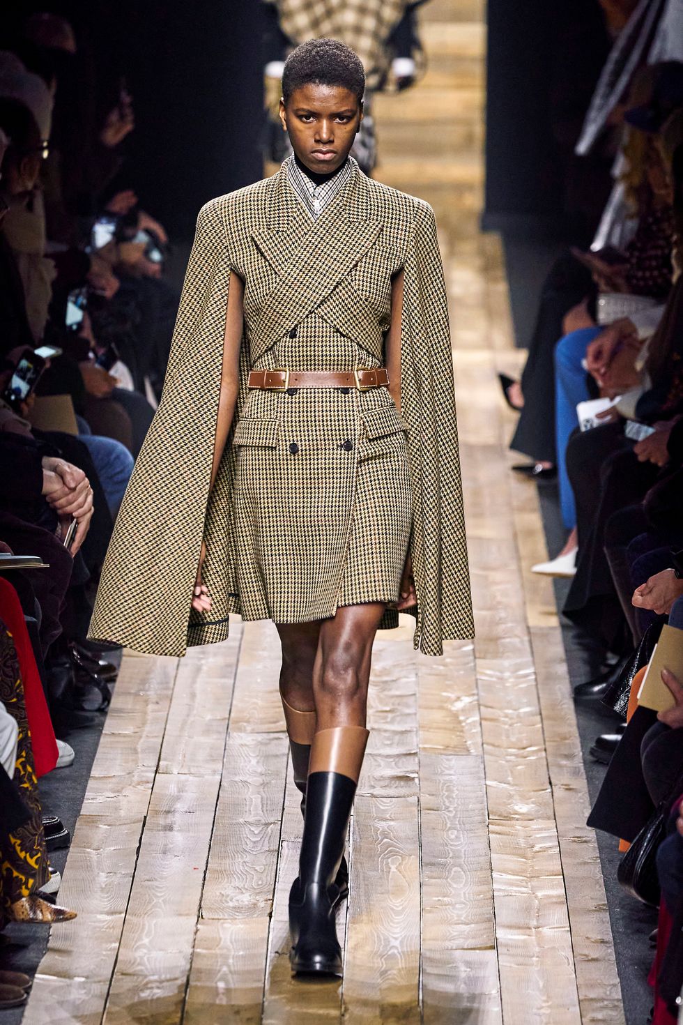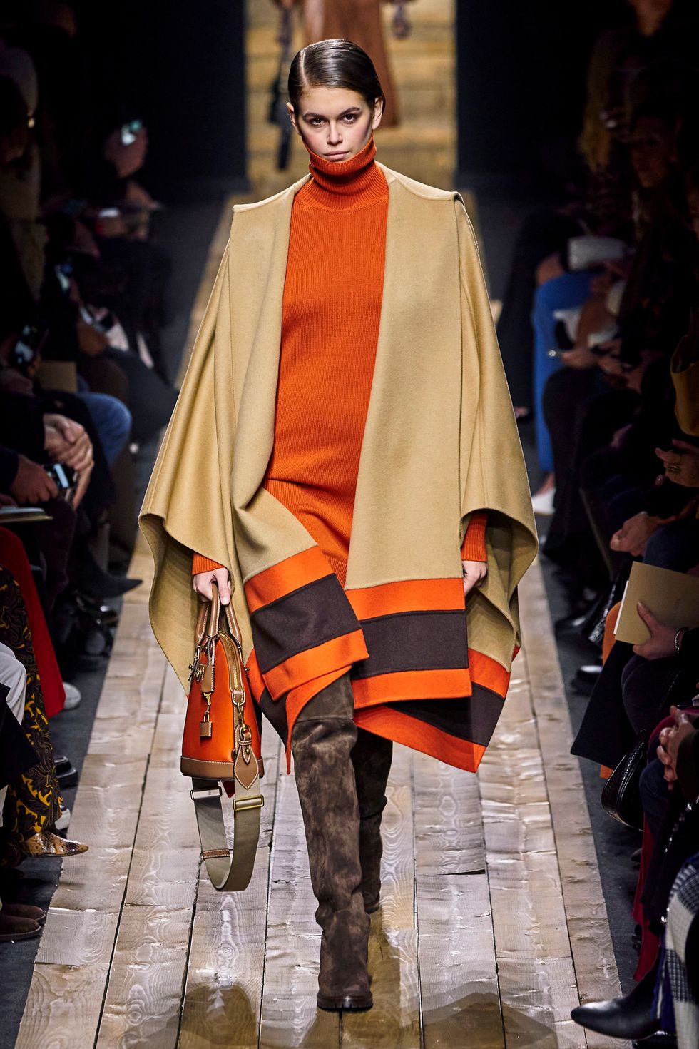 At the Michael Kors Collection Fall 2020 runway, Kaia Gerber emerged about midway through in a turtleneck and camel blanket cape with orange and black stripes that recalled a similar look worn by Naomi Campbell more than 20 years ago. (Joan Didion reportedly fell in love with it after seeing it on Campbell bought it.)