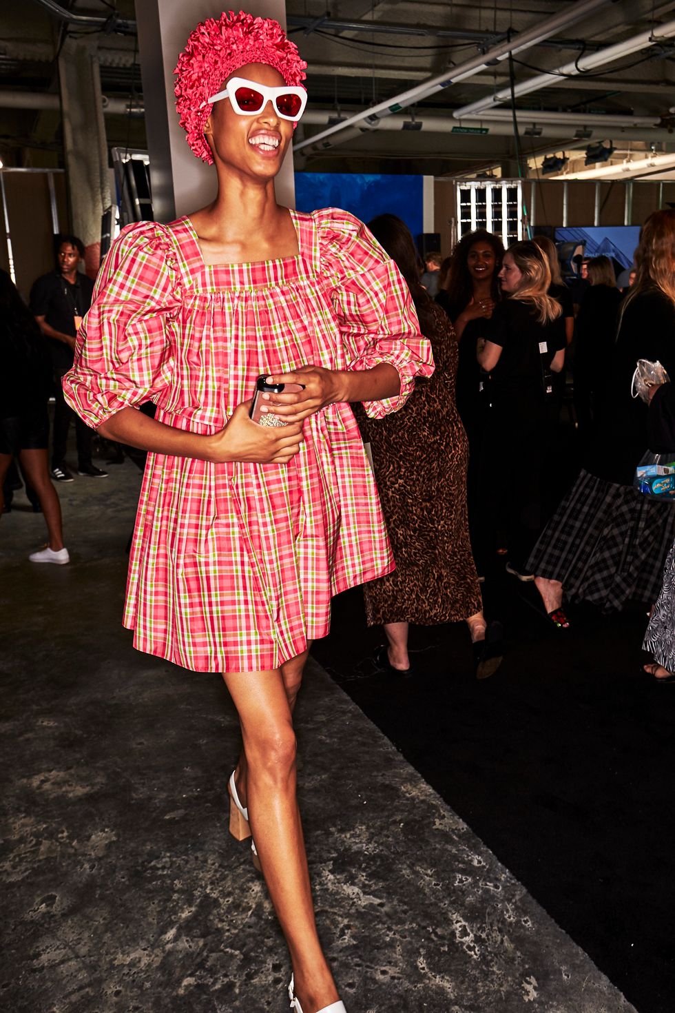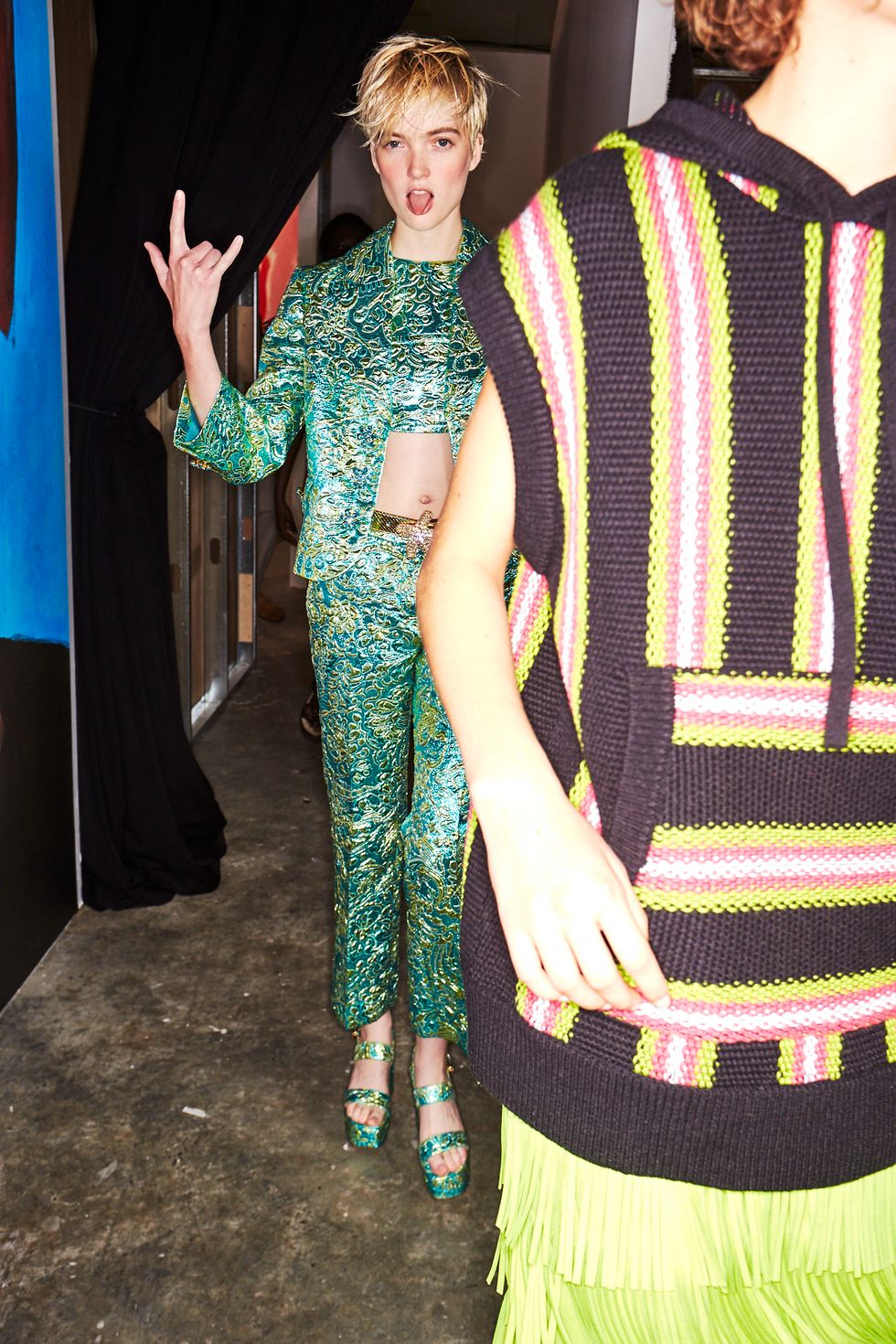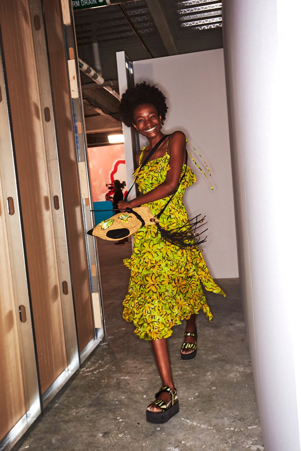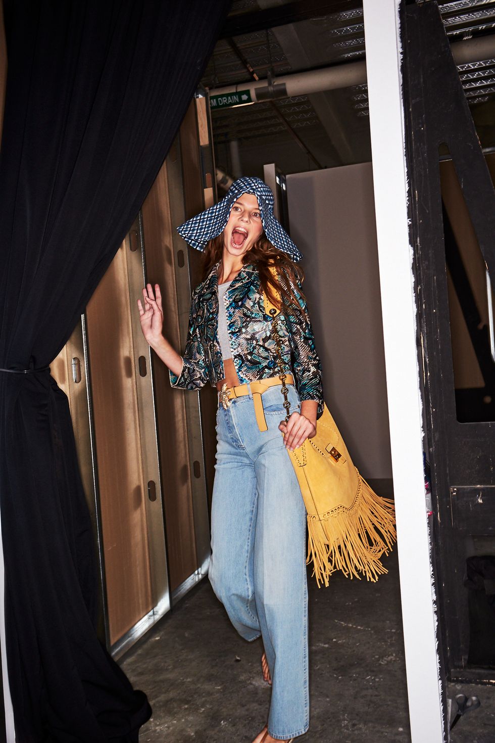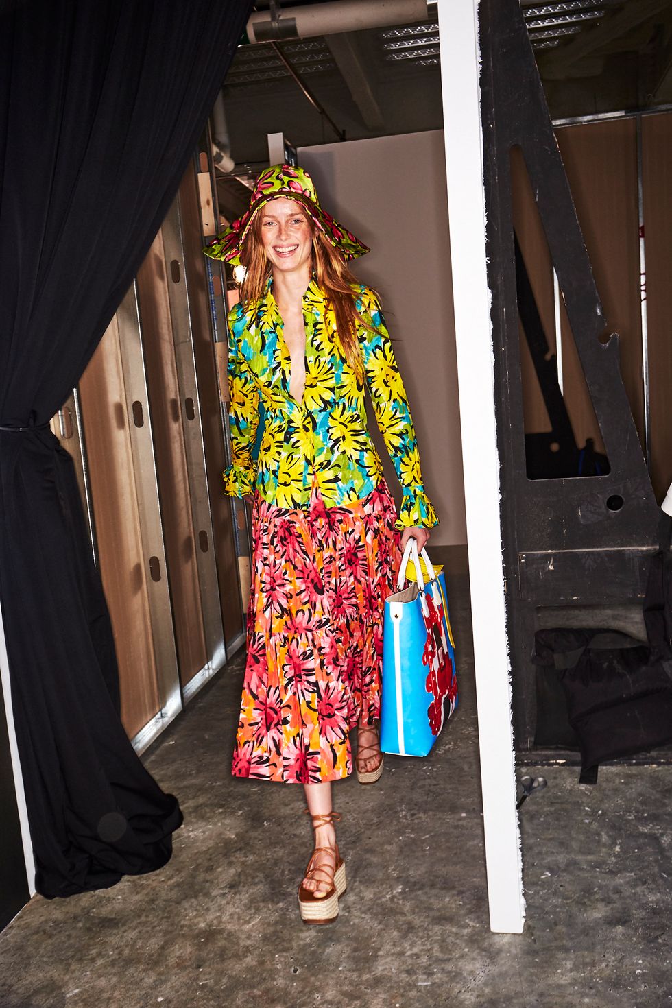 Michael Kors enlisted Brooklyn-based Australian artist Christina Zimpel to paint the seats and divider walls at his spring 2019 show at Pier 17 on the Lower East Side. The former art director of Australian Vogue also applied her bright acrylic works — mirthful scenes of umbrella dotted shorelines and sailboats at sea — to tote bags throughout the collection. Zimpel also painted a portrait of Kors wearing his signature black glasses which hung backstage.