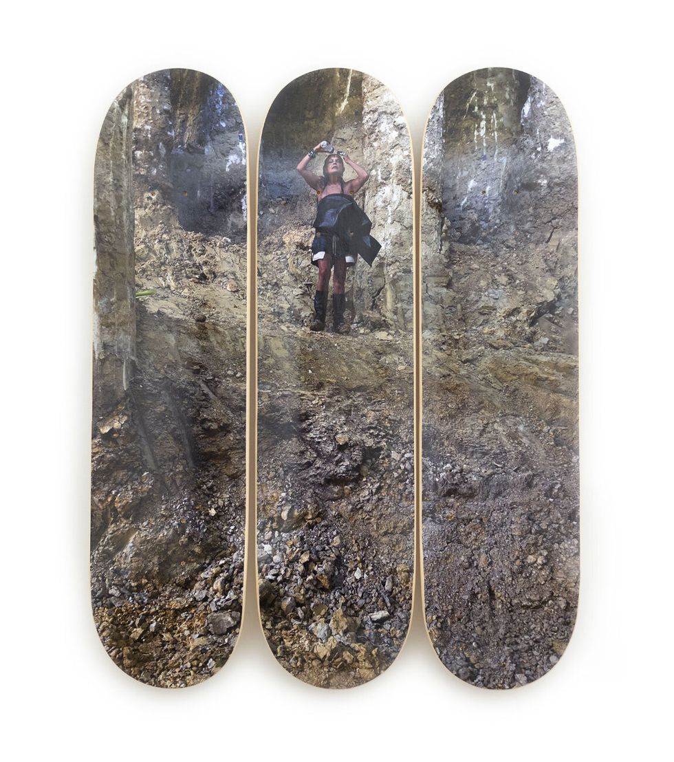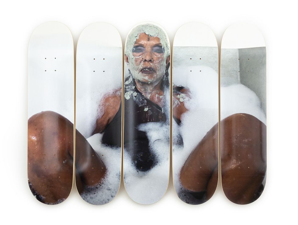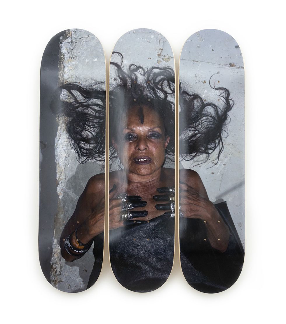 Like Lamy, the images plastered onto the bottom of these boards are one-of-a-kind, featuring her signature gold teeth and affinity for dirt. Having launched at ComplexCon on November 18, the collection includes two triptychs, a pentaptych, and a “Skate Edition” solo deck for skaters and art enthusiasts alike to choose from.