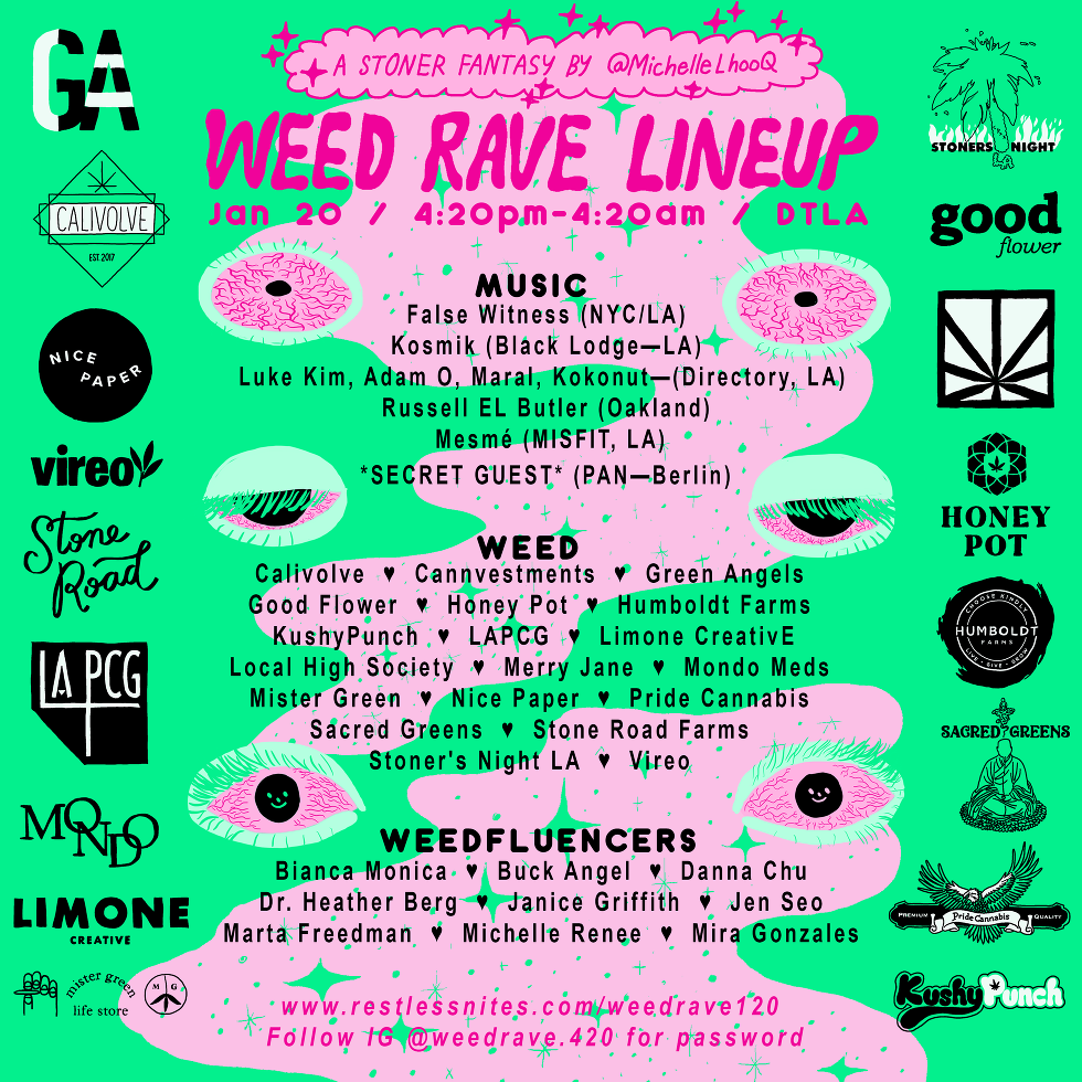 Yeah, this is also a transitional time where all of these smaller players are standing together and helping each other, which is amazing. All the companies that I've been working with have been so supportive of this rave. Most of them are run by the women and I think that that's telling! Women want to support other women. Together, we all have a chance to define what weed nightlife and what the new weed aesthetic looks like. Weed has always been associated with this stoner bro-y, psychedelic look for a while, but some of the companies that are going to be selling are leading the way in that aesthetic. It's very modern. Very sleek, very streetwear.