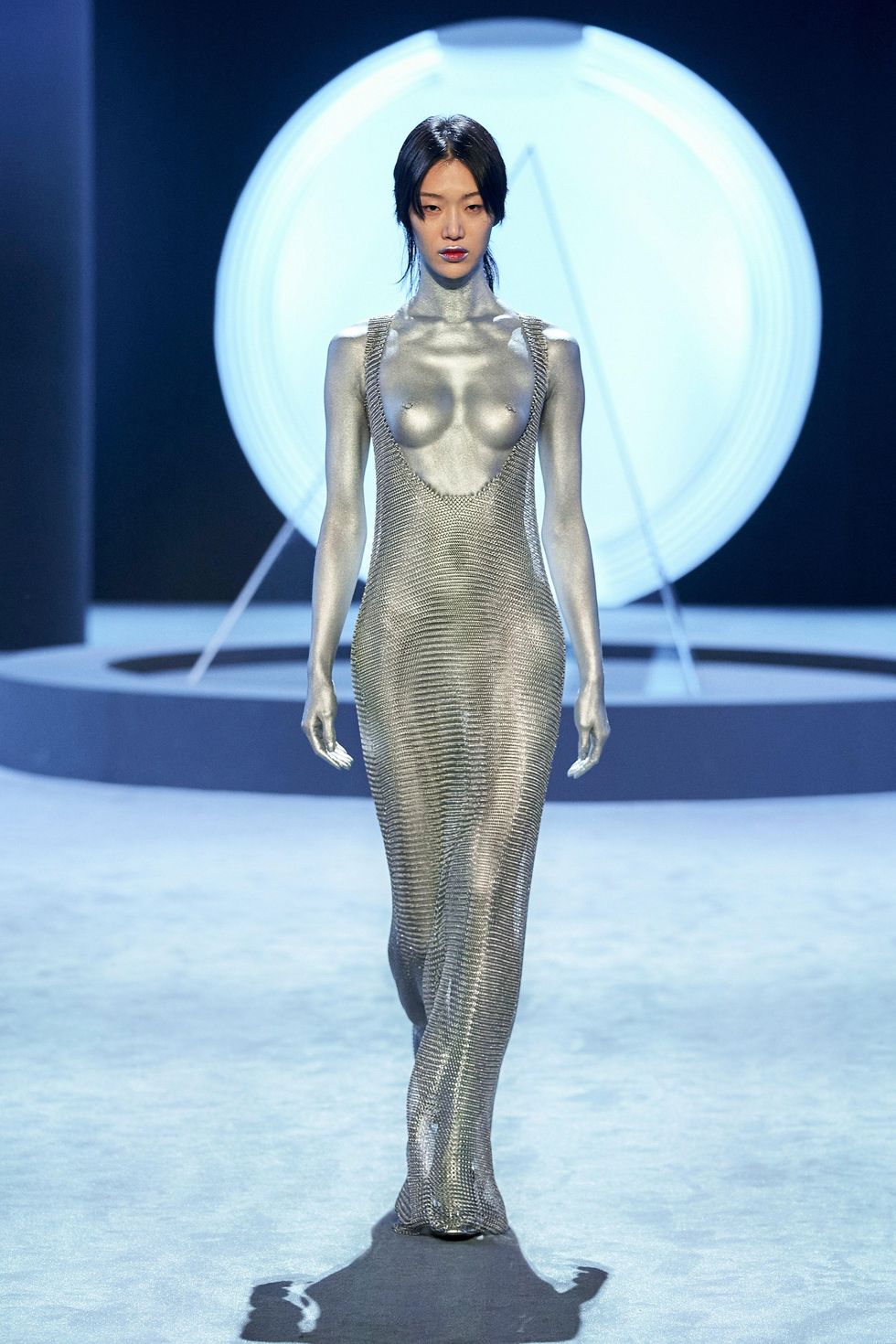 Pre-millennial sci-fi movie classics like Gattaca, Until The End Of The World, and The Matrix all influenced Paul Andrew's retro-futuristic collection for Salvatore Ferragamo, which was shown via a space-y film that blended virtual reality and CGI to great effect. The final look — a see-through chainmail dress — was worn over a model whose body was spray-painted in silver finishing. "The objective was to engineer a collection that sees the present through a prism of the future," said Andrew, "unleashing a multitude of fresh perspectives."