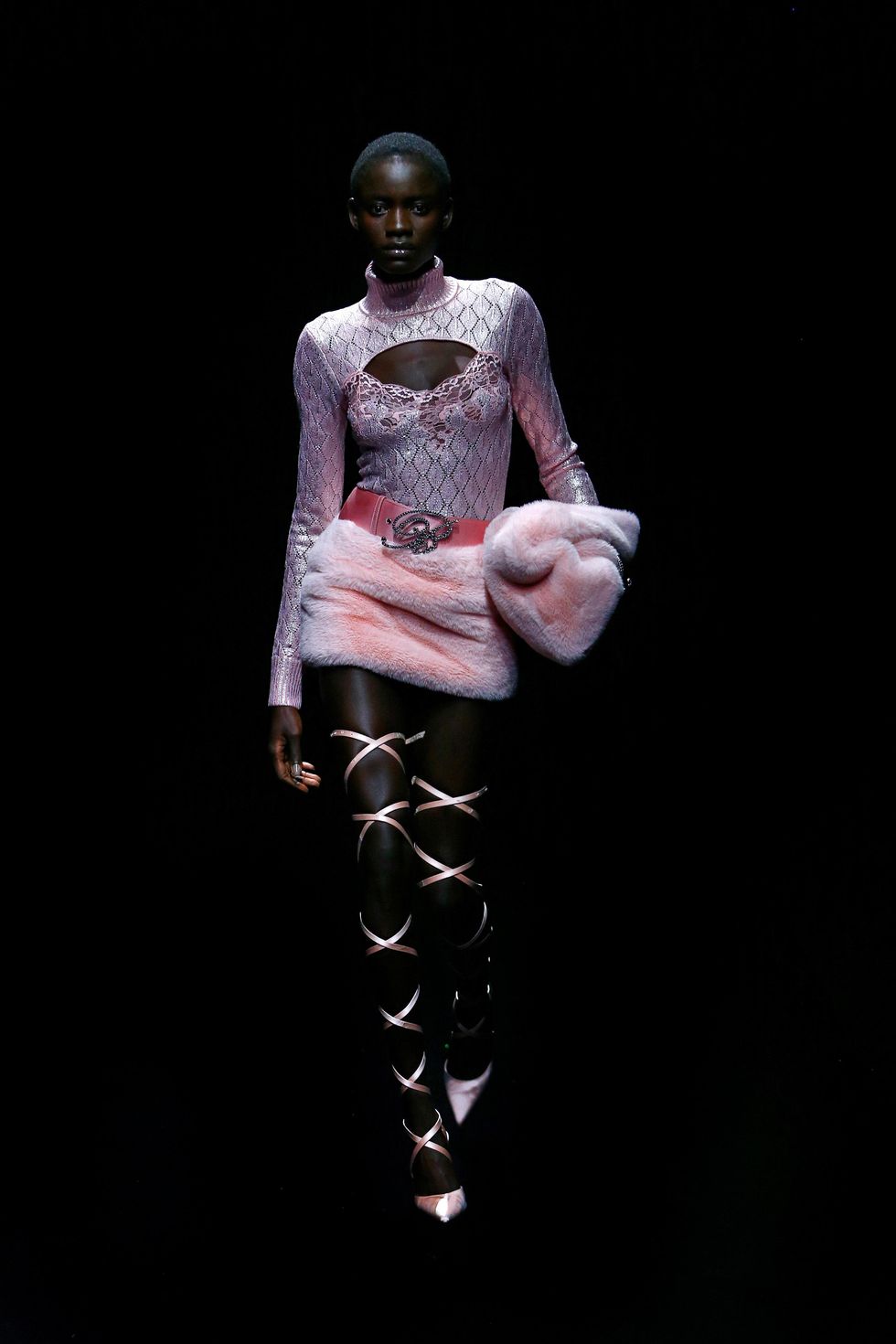 One of the few pleasant surprises of Milan Fashion Week (the other being Philosphy), Blumarine served up a throwback to sexy early aughts dressing circa Paris Hilton and Britney Spears complete with furry miniskirts, hip-slung low-rise jeans and even butterfly nipple pasties. The brand is known for its watercolor palette and romantic flourishes, but as new creative director Nicola Brognano tells Vogue, his Blumarine is "more dirty, bitchy, sexier," a sentiment many of us can get behind these days.