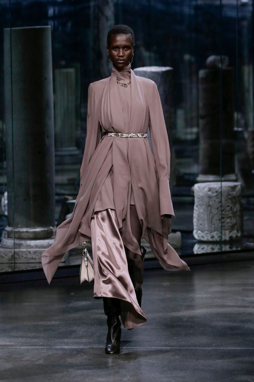 For his first ready-to-wear outing at Fendi (he showed his first couture collection for the brand just a few weeks earlier), Kim Jones eschewed the brand's signature flashy logos and monograms for a more subdued yet elegant approach. While the color palette was muted, there was a mix of materials, layering and shine that made for a versatile wardrobe complete with big statement furs — the house signature — and prized accessories.