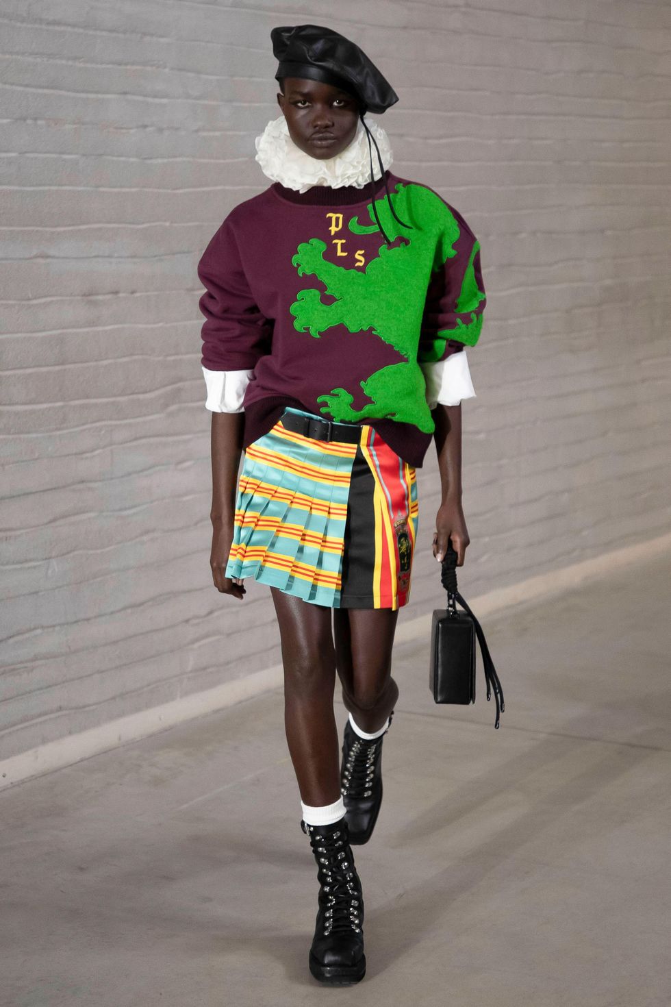 If only the students at my high school looked this immaculate. Philosophy Di Lorenzo Serafini went full on prep mode thanks to its use of letterman sweaters and jackets with heritage crests and collegiate uniforms. Stylist Ib Kamara lended an incredible touch of Italian cool-teen glamour to the lineup by adding berets, square-toed boots and padded scarves in funky, neon colors and plaid prints.