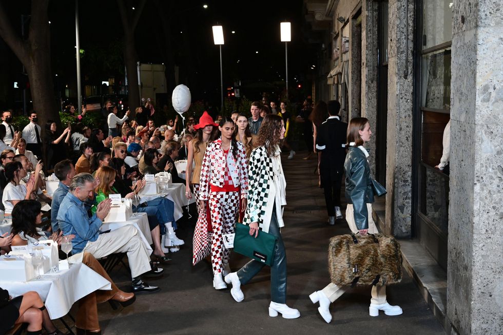 MM6 Maison Margiela took over a Milan cafe for their Spring 2022 runway show complete with boxed meals and aperitifs atop tables in white linens wrapped around the corner. The models, dressed in graphic chessboard-printed suits, protruding ruffled collars, furry footwear and giant bags, evoked a giddy and joyful whimsy. It was a celebration of the return to what many of us missed most during lockdown: eating out, socializing, city life.