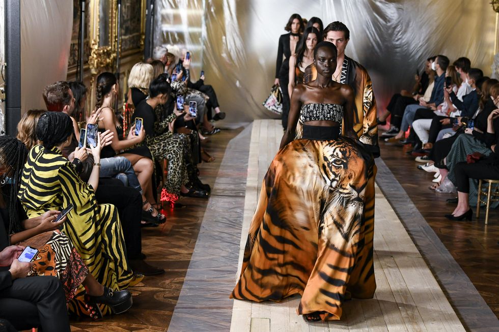 Puglisi did not stray away from the bold animal prints and motifs he introduced for his first collection, with tiger and zebra stripes decorating everything from ball gowns to slinky cutout dresses. But he also explored some softer elements like watercolor-hued prints and light florals on ladylike dresses. Meanwhile, a reinterpretation of a body-hugging tiger dress from its landmark Fall 2000 collection (made famous by Cindy Crawford) was an homage to the brand's past while looking head on to the future.