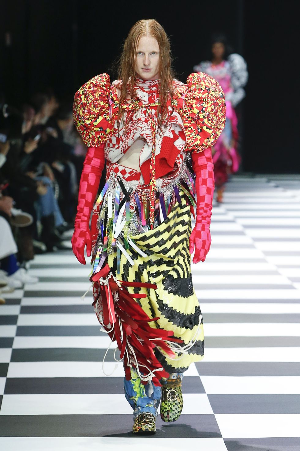One of the biggest Milan highlights last season was London-based designer Miss Sohee's dreamy, opulent presentation that was supported by Dolce & Gabbana, showing how resources and funding can make a huge different for young designers with limited means but tons of creative ideas. The same happened on the last day of MFW this season with British designer Matty Bovan repurposing old D&G archives into his signature maximalist, psychedelic aesthetic with checkerboard corsets, super wide skirts and papier-mâché jewelry.