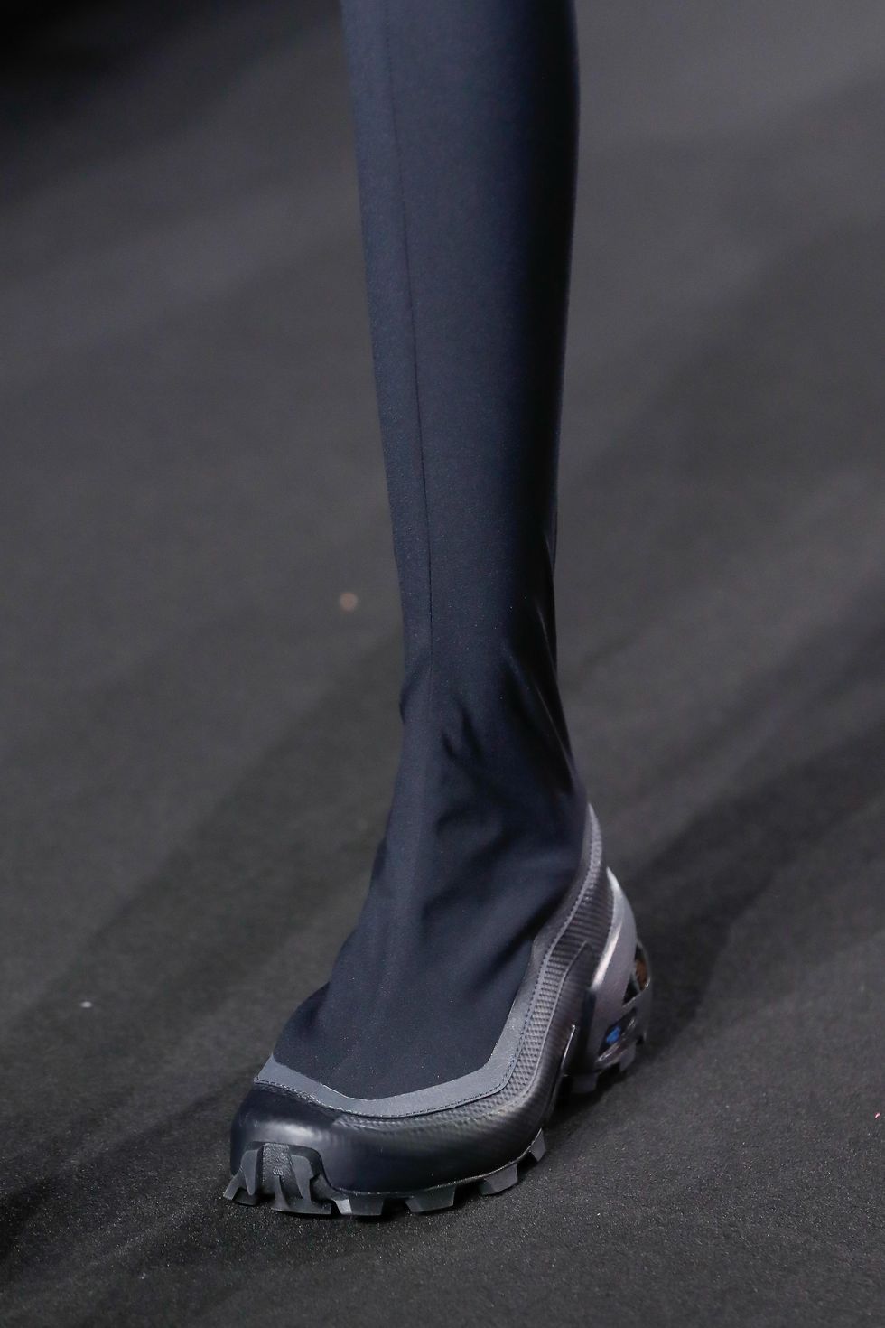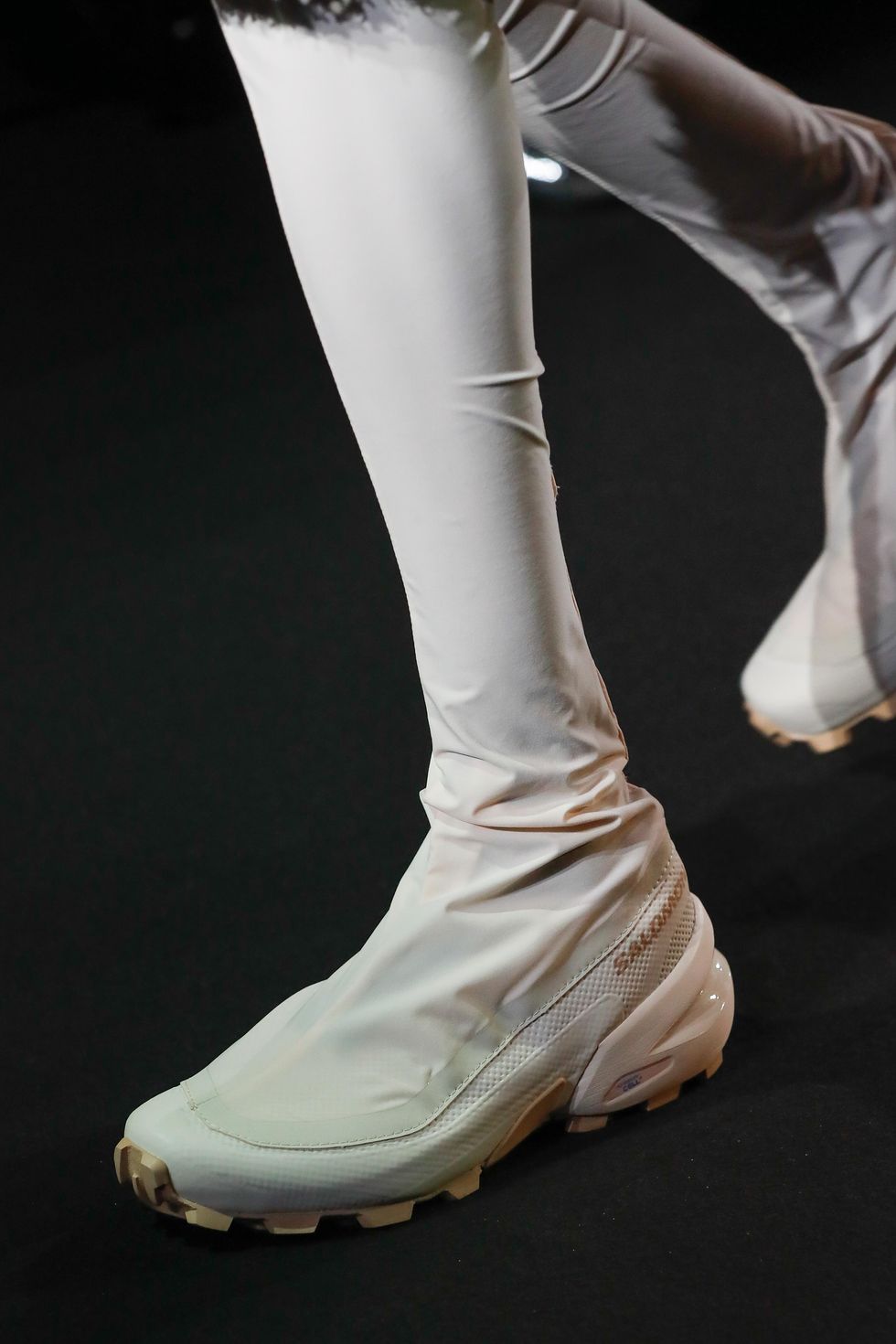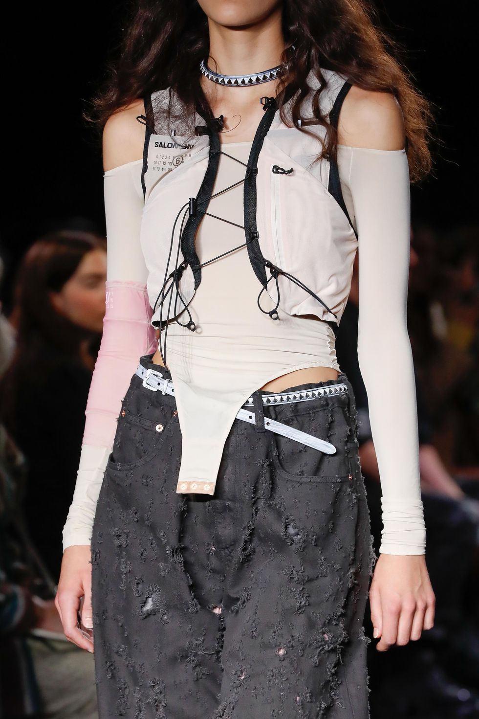 After first teaming up for Fall 2022, MM6 Maison Margiela and Salomon are continuing their collaboration, debuting its latest iteration on the former's Spring 2023 runway in Milan. This time around, there's an MM6 Salomon Adv Skin 5 running vest, as well as the French outdoor sports brand’s signature sole tooling in blush and black thigh-high boots.