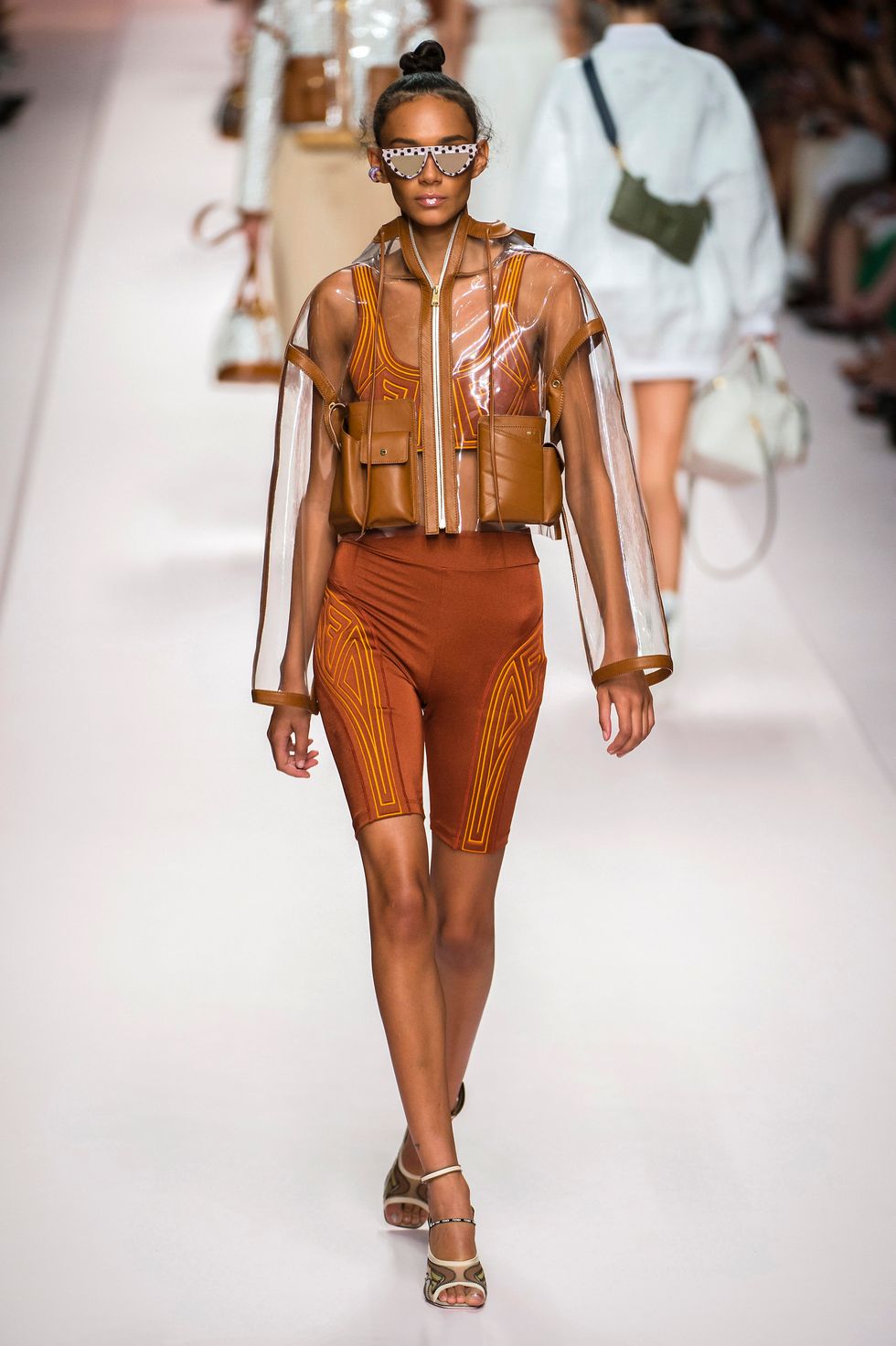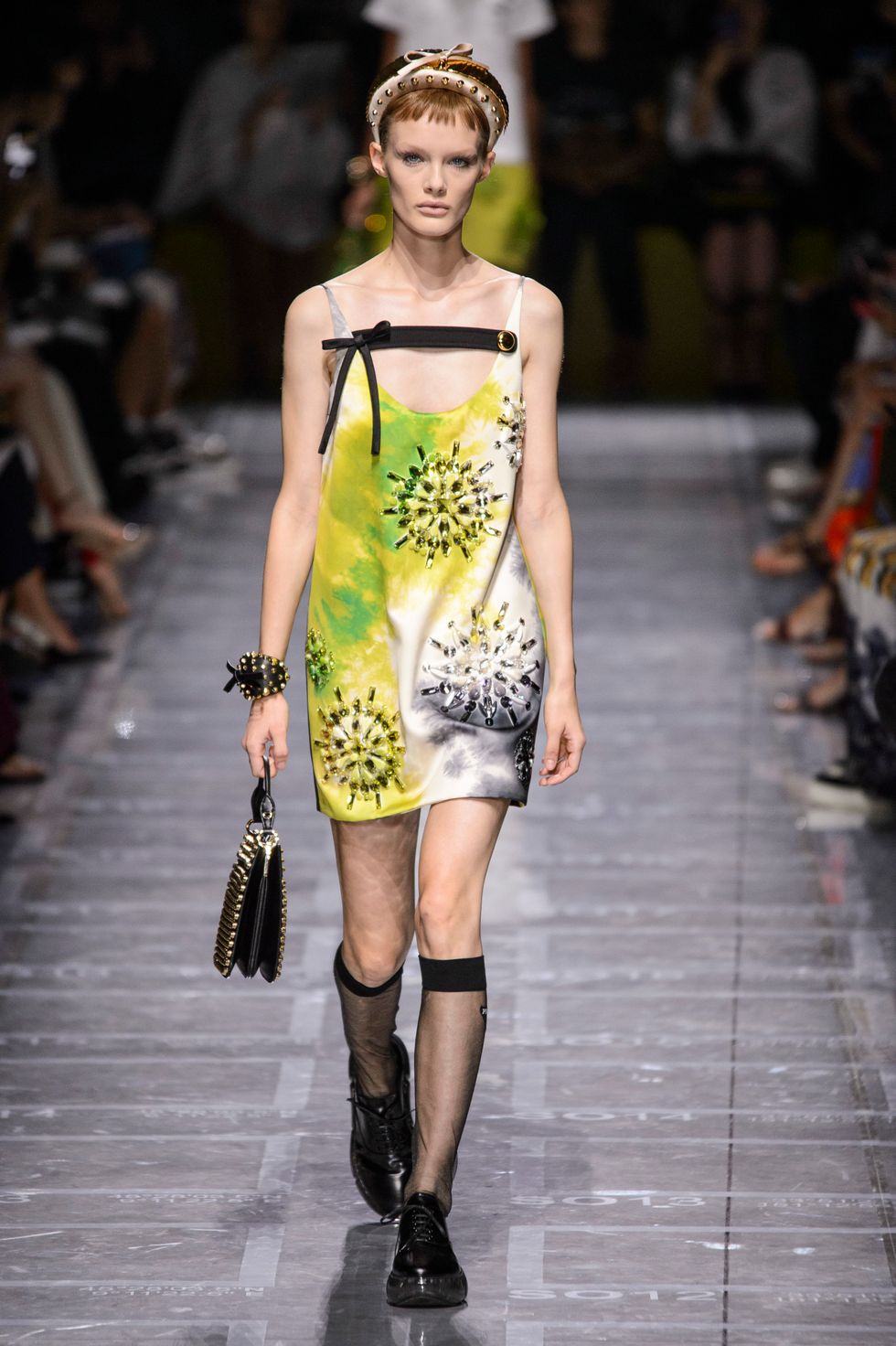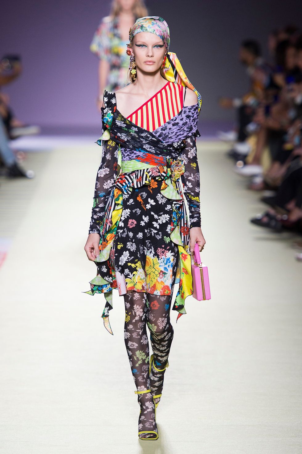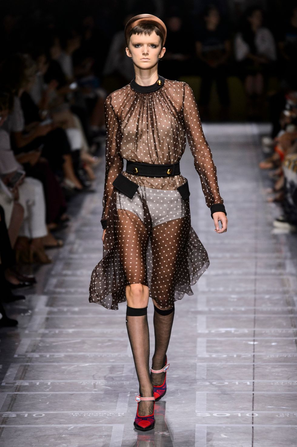 Eccentricity and sexiness went head to head during Milan Fashion Week. Iridescent fabrics, an implosion of prints, and kaleidoscopic tie dye motifs were entirely transfixing, while the little black dress and its fishnet counterpart preserved quintessential Milanese sensuality. Bridal veils (as seen in London) along with bike shorts and a healthy dose of ostrich feathers (as spotted in New York) have cropped up again, firming up the overall direction for spring 2019. See 10 of our favorite trends from MFW, below.