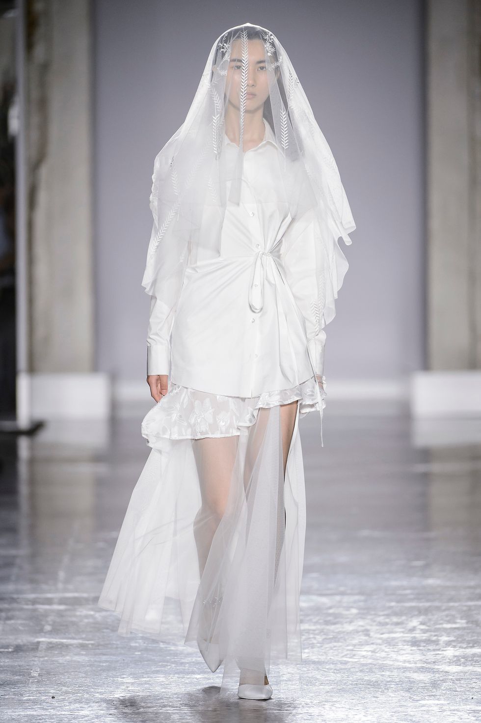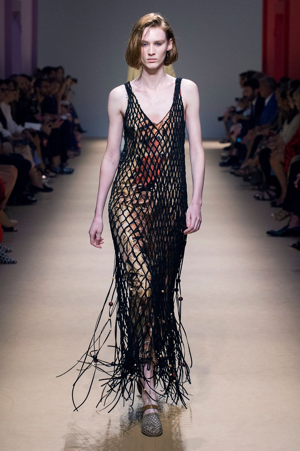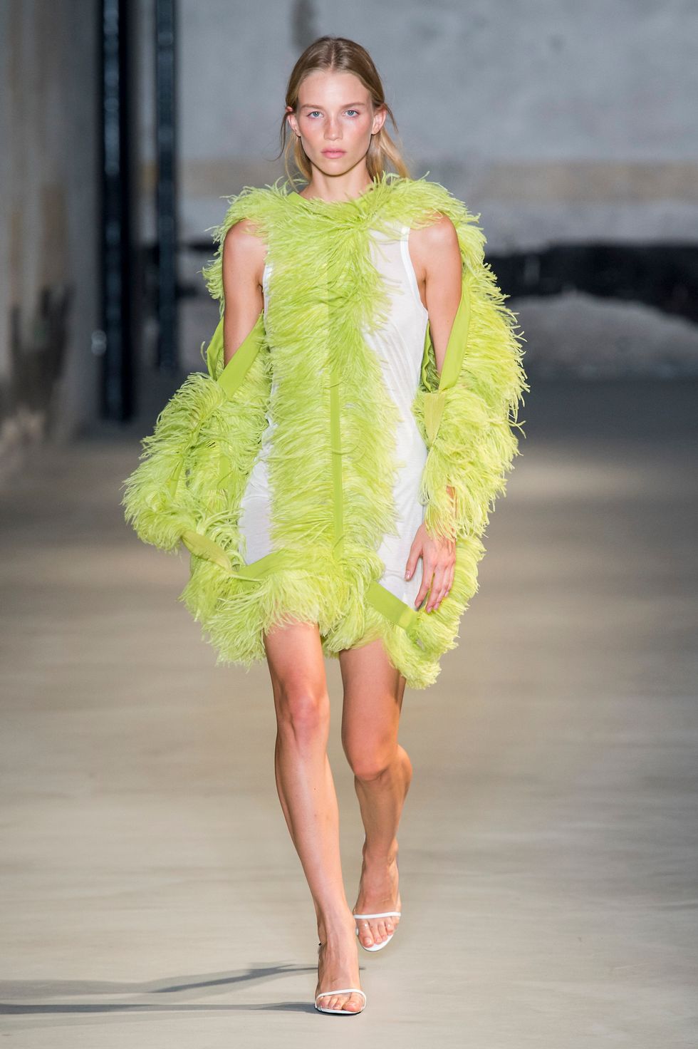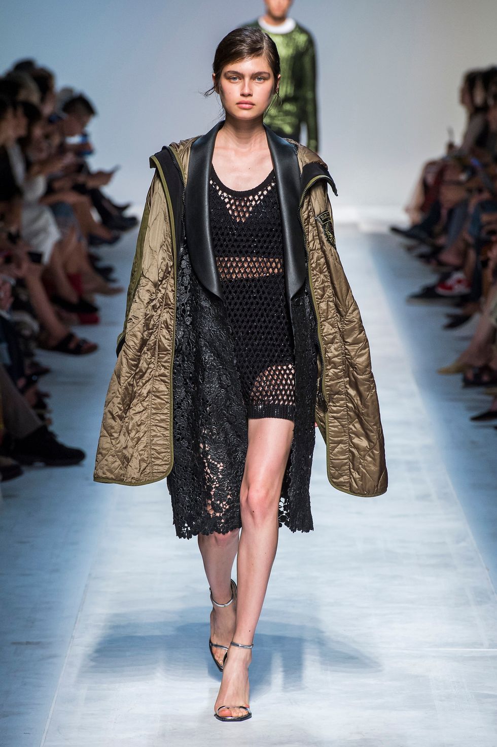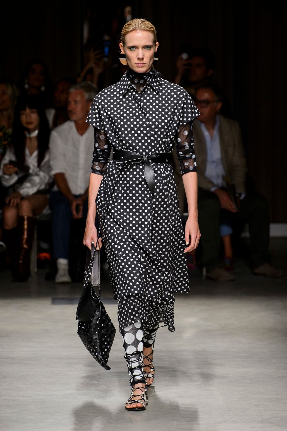 Eccentricity and sexiness went head to head during Milan Fashion Week. Iridescent fabrics, an implosion of prints, and kaleidoscopic tie dye motifs were entirely transfixing, while the little black dress and its fishnet counterpart preserved quintessential Milanese sensuality. Bridal veils (as seen in London) along with bike shorts and a healthy dose of ostrich feathers (as spotted in New York) have cropped up again, firming up the overall direction for spring 2019. See 10 of our favorite trends from MFW, below.