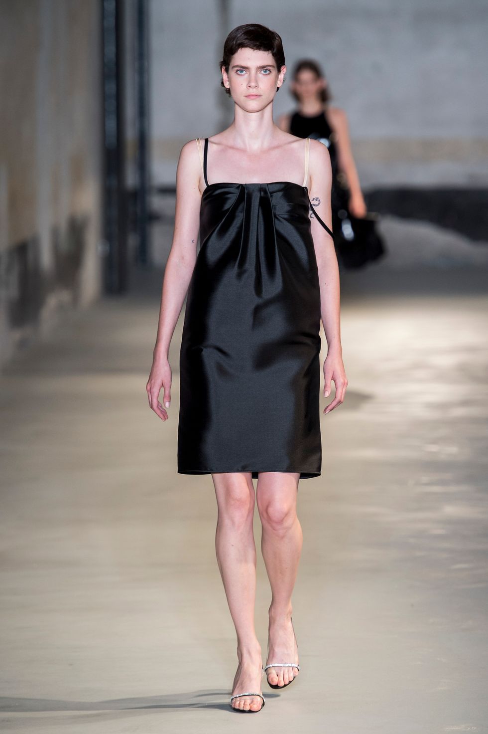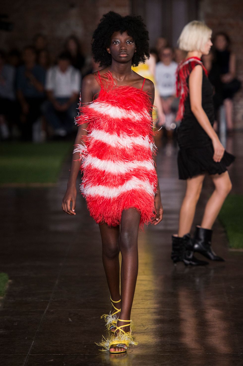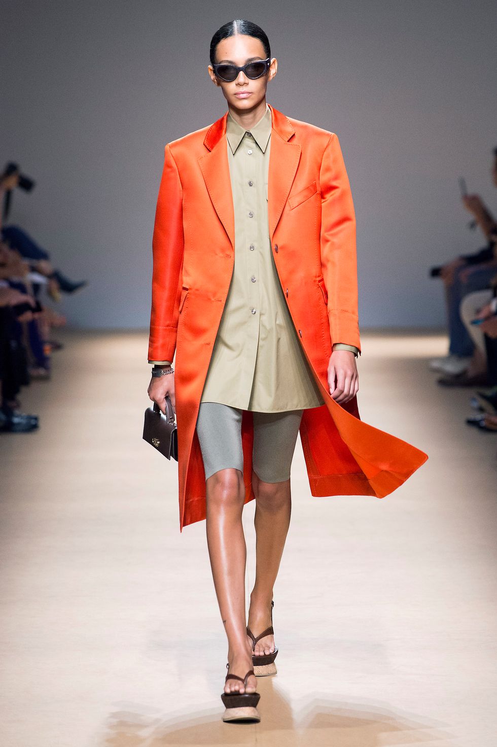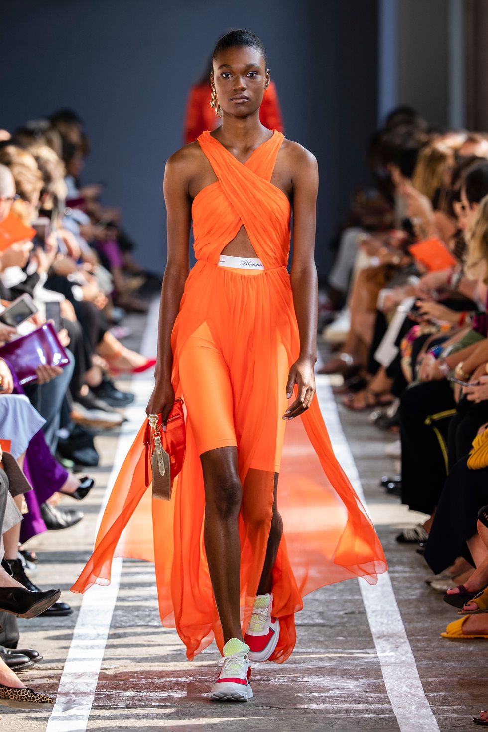 Eccentricity and sexiness went head to head during Milan Fashion Week. Iridescent fabrics, an implosion of prints, and kaleidoscopic tie dye motifs were entirely transfixing, while the little black dress and its fishnet counterpart preserved quintessential Milanese sensuality. Bridal veils (as seen in London) along with bike shorts and a healthy dose of ostrich feathers (as spotted in New York) have cropped up again, firming up the overall direction for spring 2019. See 10 of our favorite trends from MFW, below.