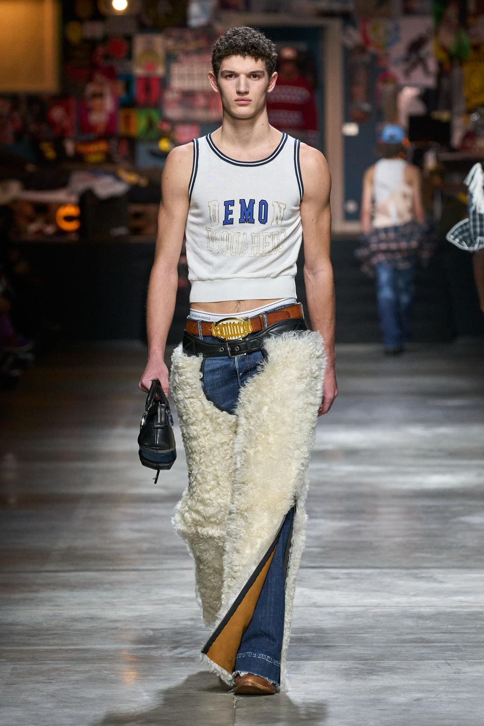The trashy teen vibes at Dsquared2 were rampant at the brand's co-ed show featuring TikTok stars and a collegiate dorm room set on the runway. It was signature Dsquared2 — a sexy, raunchy mashup of eclectic Y2K-style references (shoutout to Haley Wollens who styled the hell out of this show. A section of ironic slogan tees ("Choke" in the Coca Cola font and "Emo" in bold against "Demon" were some viral hits) and accessories like tiara caps and "I love beer" belts made for one of the more memorable (and best) Dsquared2 shows in years.