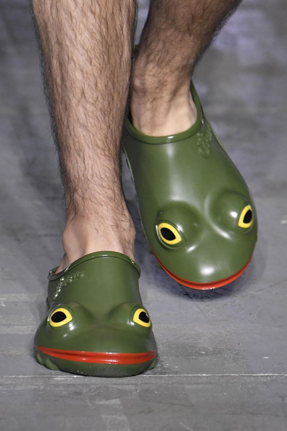 Jonathan Anderson teased the funky green frog slip-ons before the day of his show in Milan. Turns out the slides and boots were from Wellipets, a brand that was once a certain British royal family offspring. There were frog bags, too, the latest addition to JW Anderson's quirky animal accessories range following the viral pigeon clutch that debuted last year.
