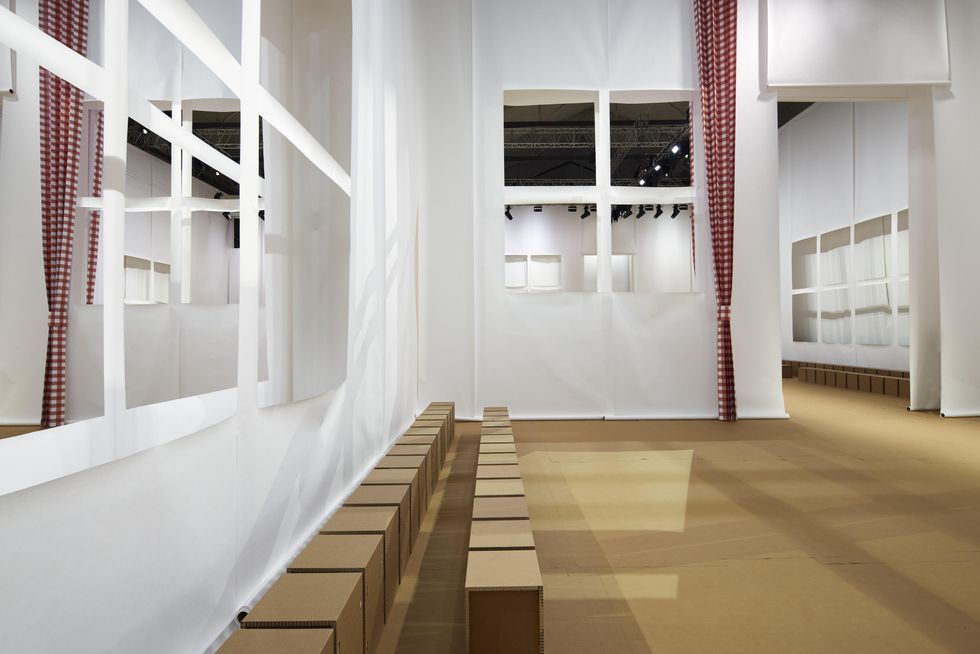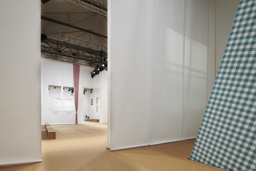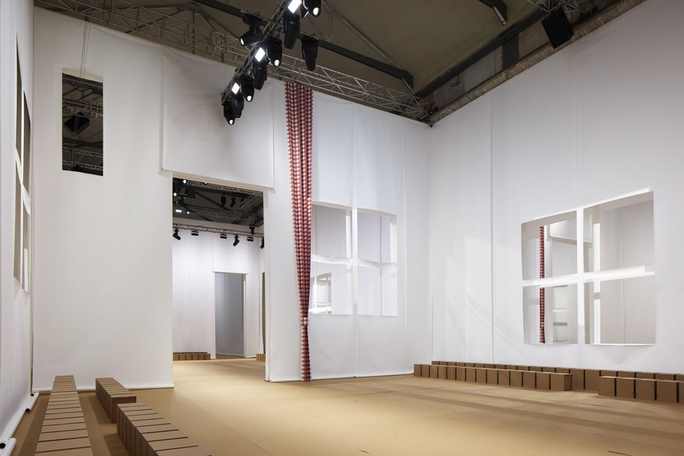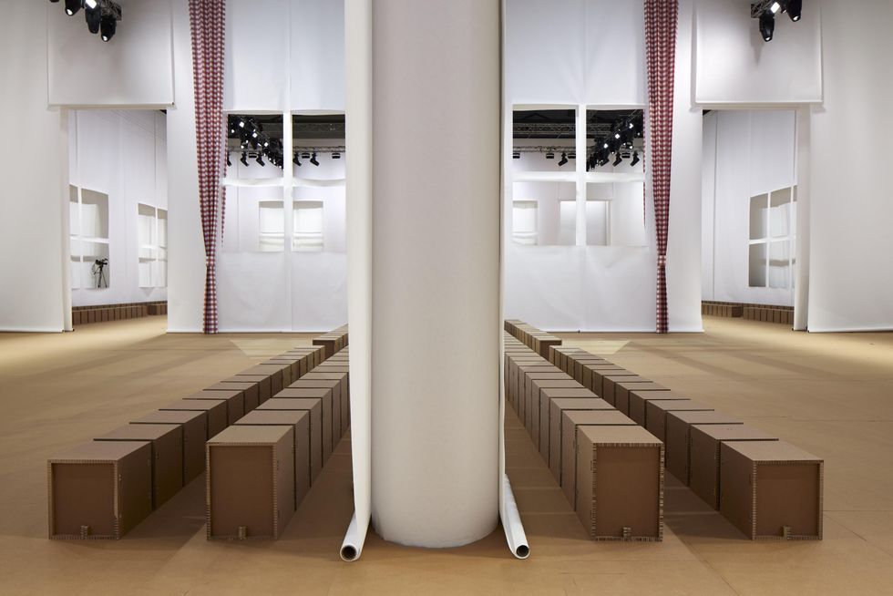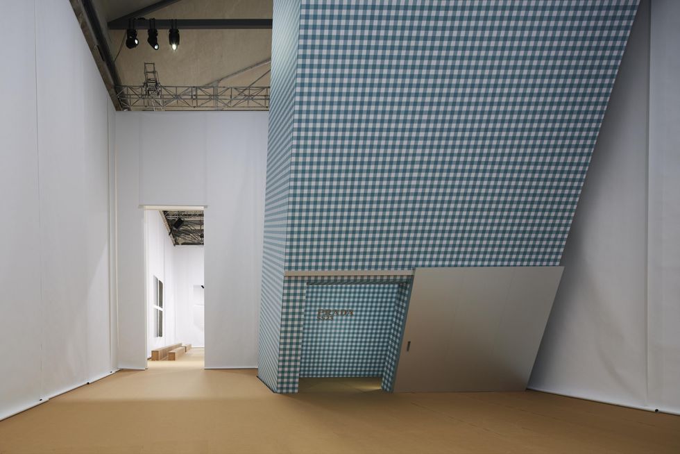 Once again held at the Fondazione Prada, the brand's contemporary art center designed by Rem Koolhaas, the set resembled a blown-up suburban house interior. The white walls, browns floors and gingham curtains were all made of raw-edged paper — the invitation also came with a paper gingham coat — while cardboard cube seats lined the perimeter.
