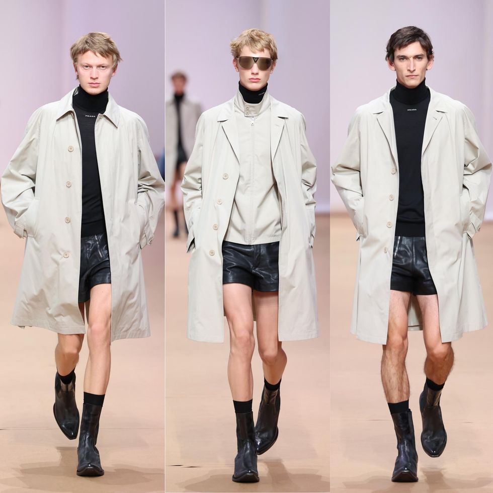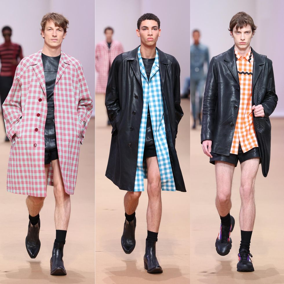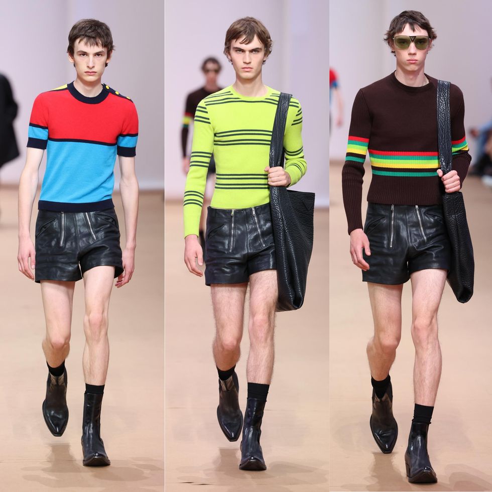 Rather than one recurring motif, the collection was broken up into several groups, from picnic-ready gingham checks to light-wash denim. A range of sweaters came in graphic, bold stripes in neon and primary colors, while the collection finished off with a set of beige mac coats with black turtlenecks and leather shorts with double zippers.