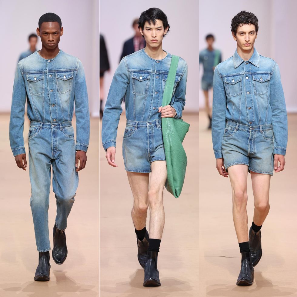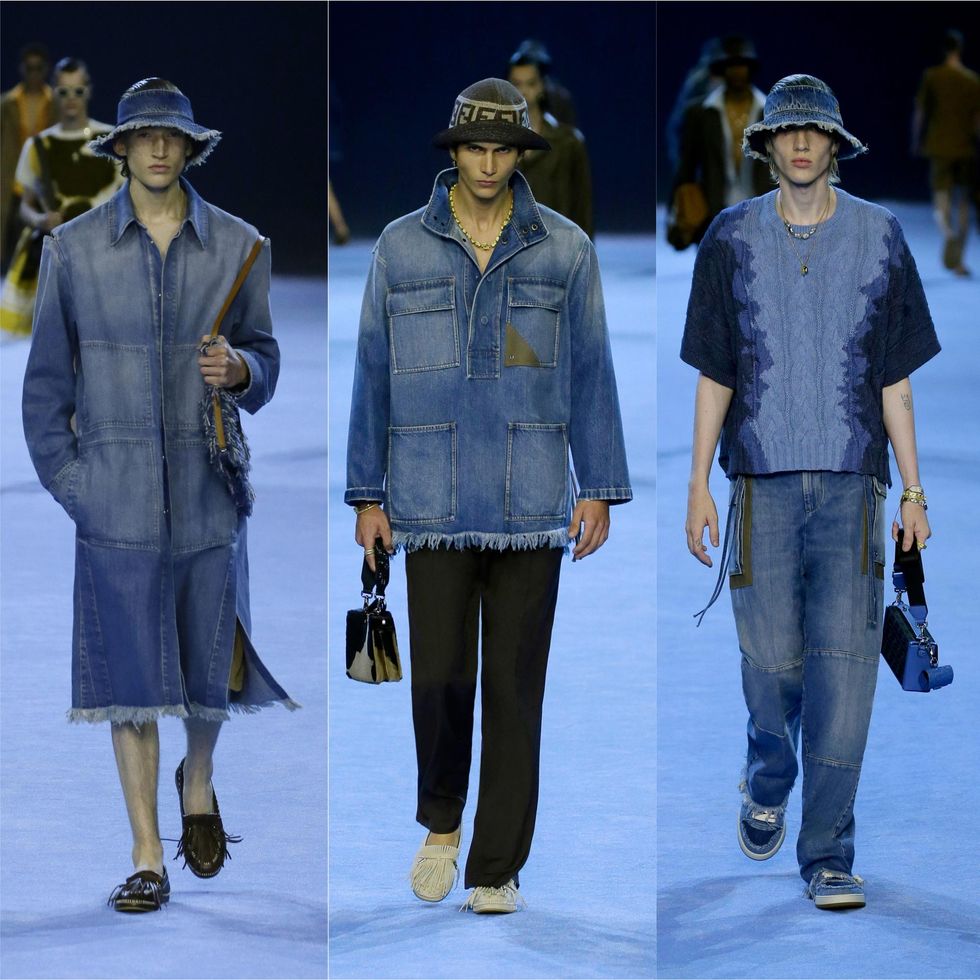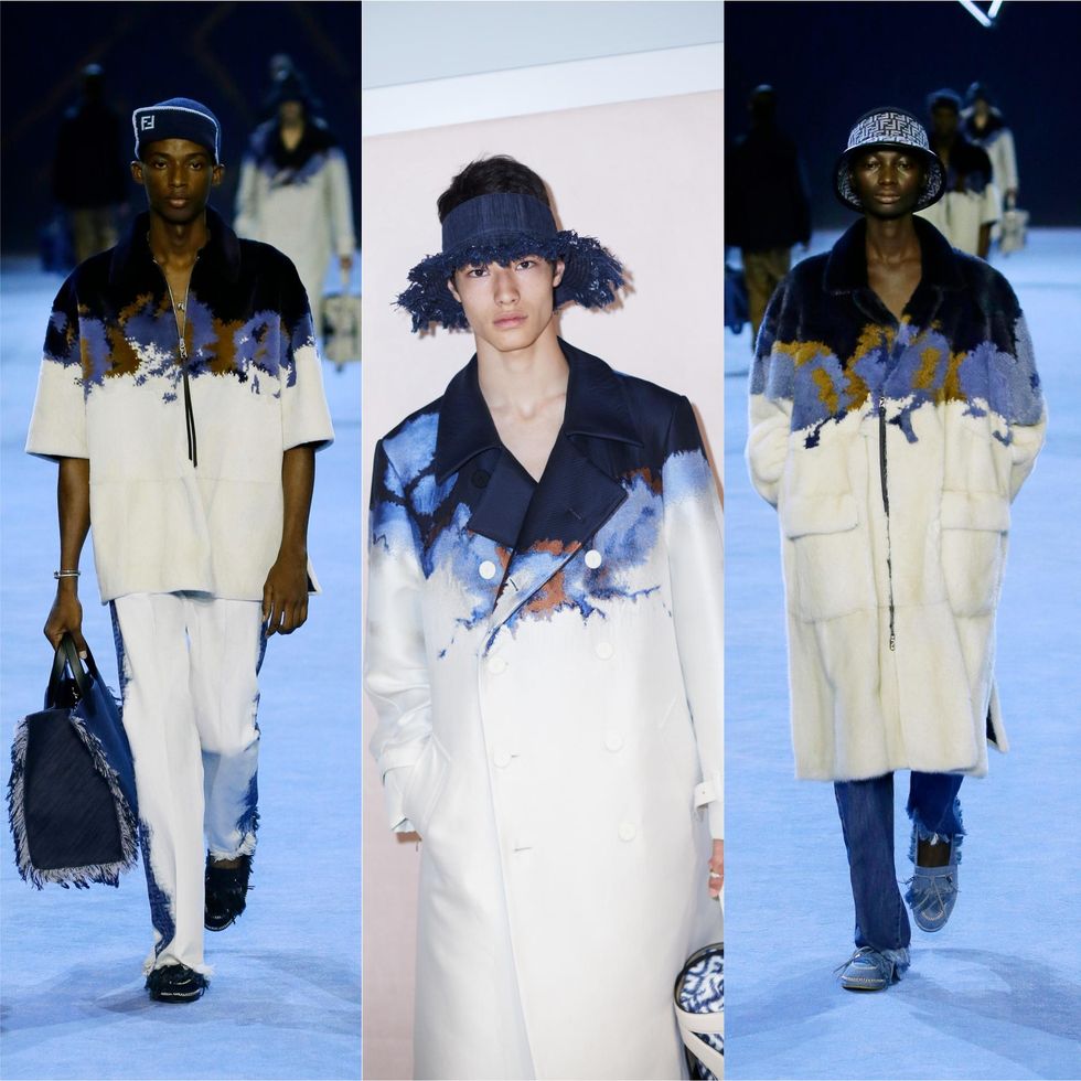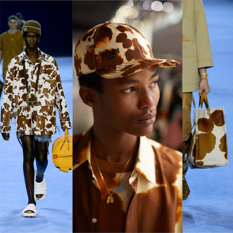 After last season's outing of classic occasion-wear for the polished gentleman (remember that dandy finale look?), Spring is much more relaxed and carefree, with words like "freedom" and "ease" punctuating the shownotes. Silvia Venturini Fendi's idea of a destination wardrobe includes things like cowhide prints, casual Trompe-l'œil looks, experimental denim and painterly prints on coats and loose-fitting shirts.