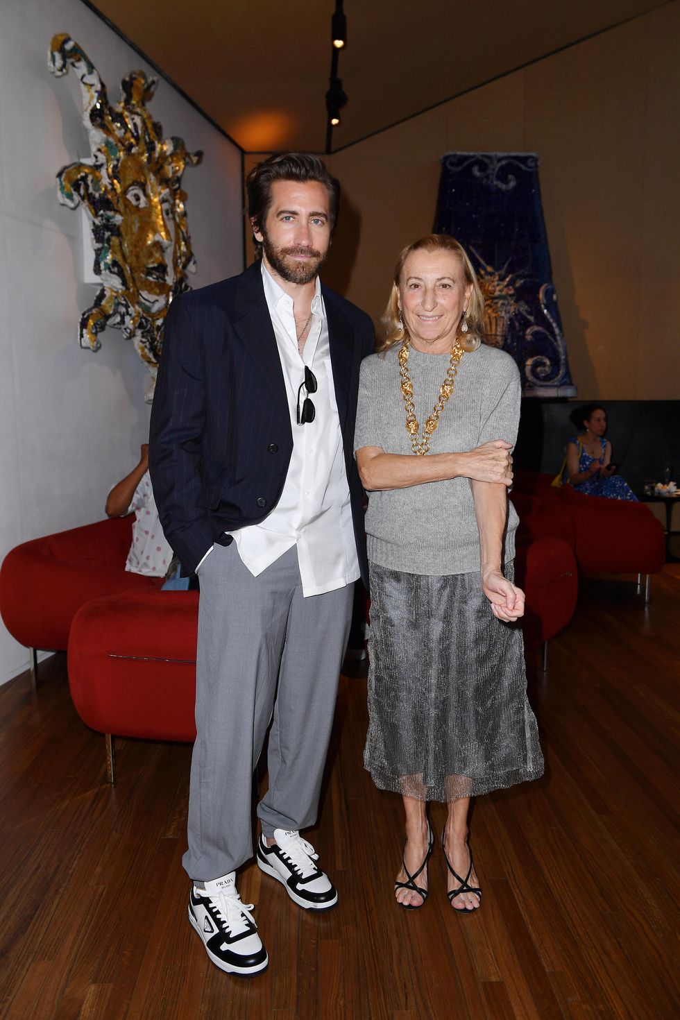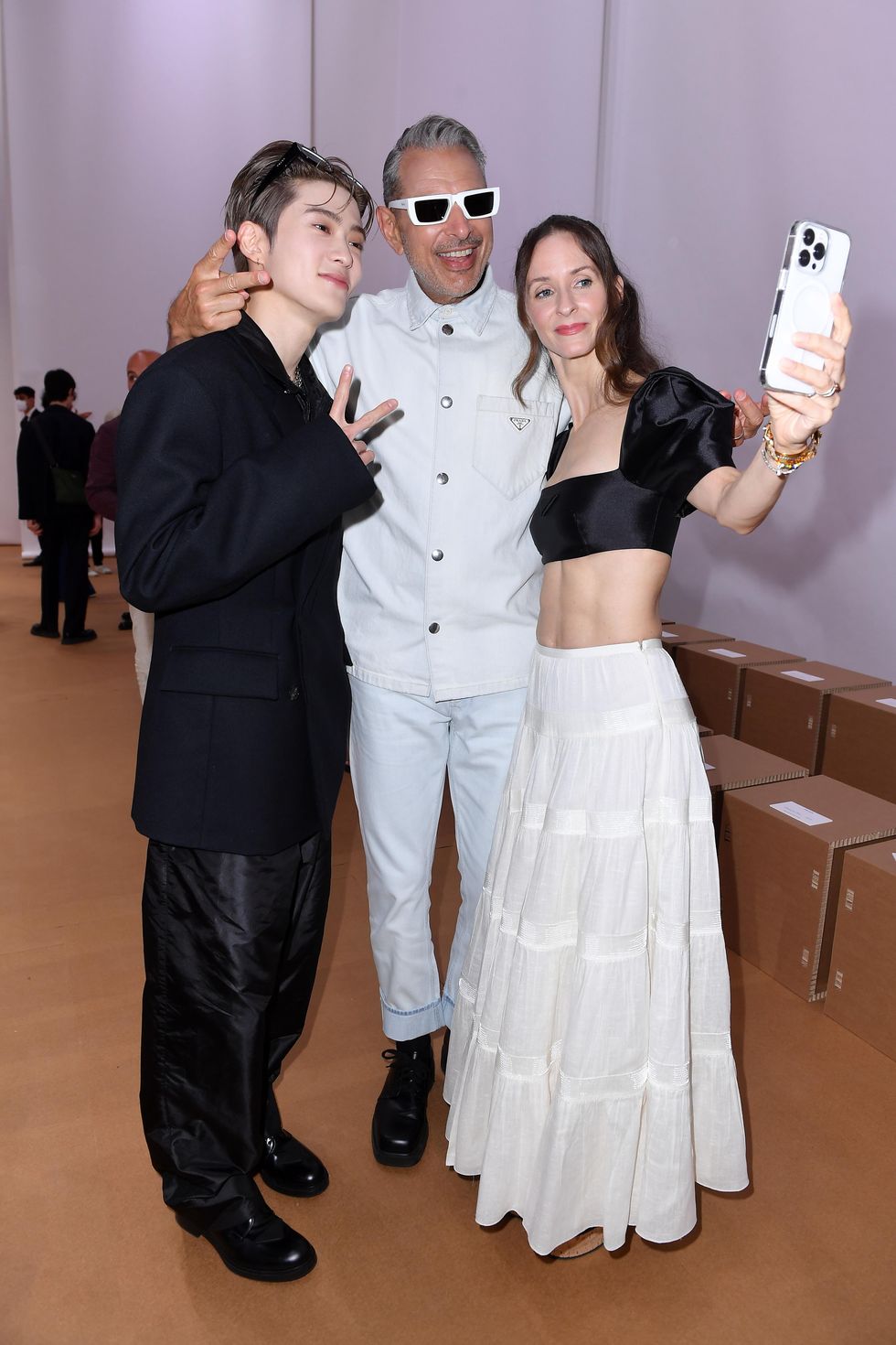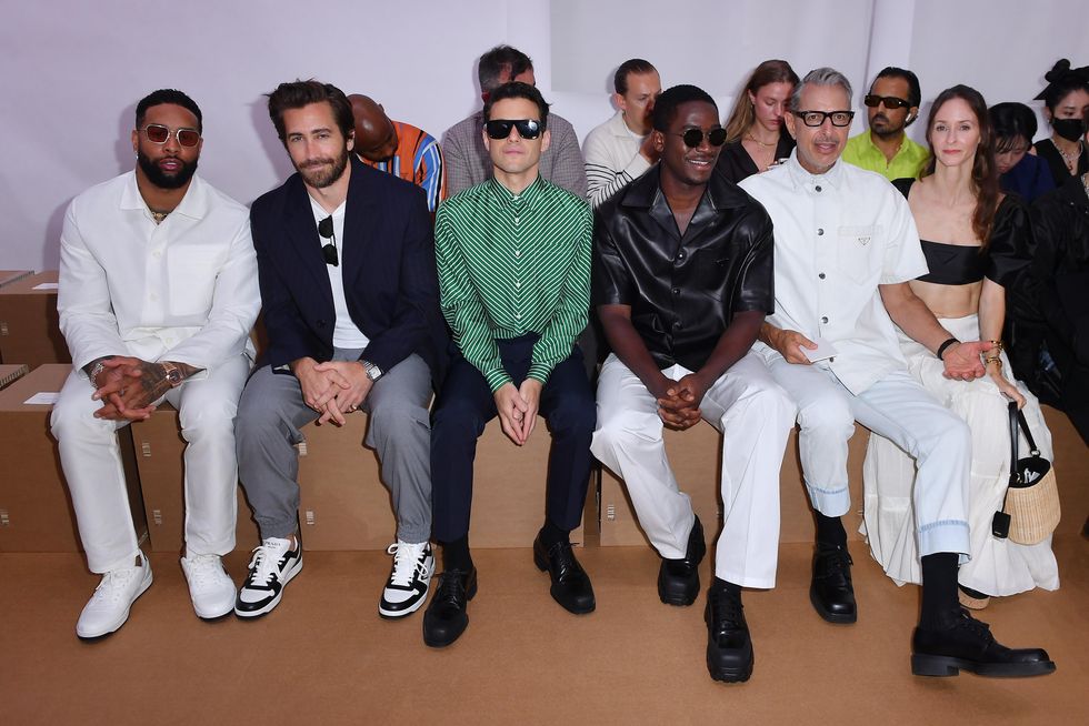 Jeff Goldblum, the breakout runway star at the last men's show, was seated in the audience this time around next to wife Emilie Livingston. He was in the front row with fellow Prada Men's Fall 2022 campaign star Rami Malek, as well as Elite's Manu Rios, NCT's Jaehyun and the face of Prada's Luna Rossa Ocean fragrance Jake Gyllenhaal — all of whom joined Prada for the dinner after.